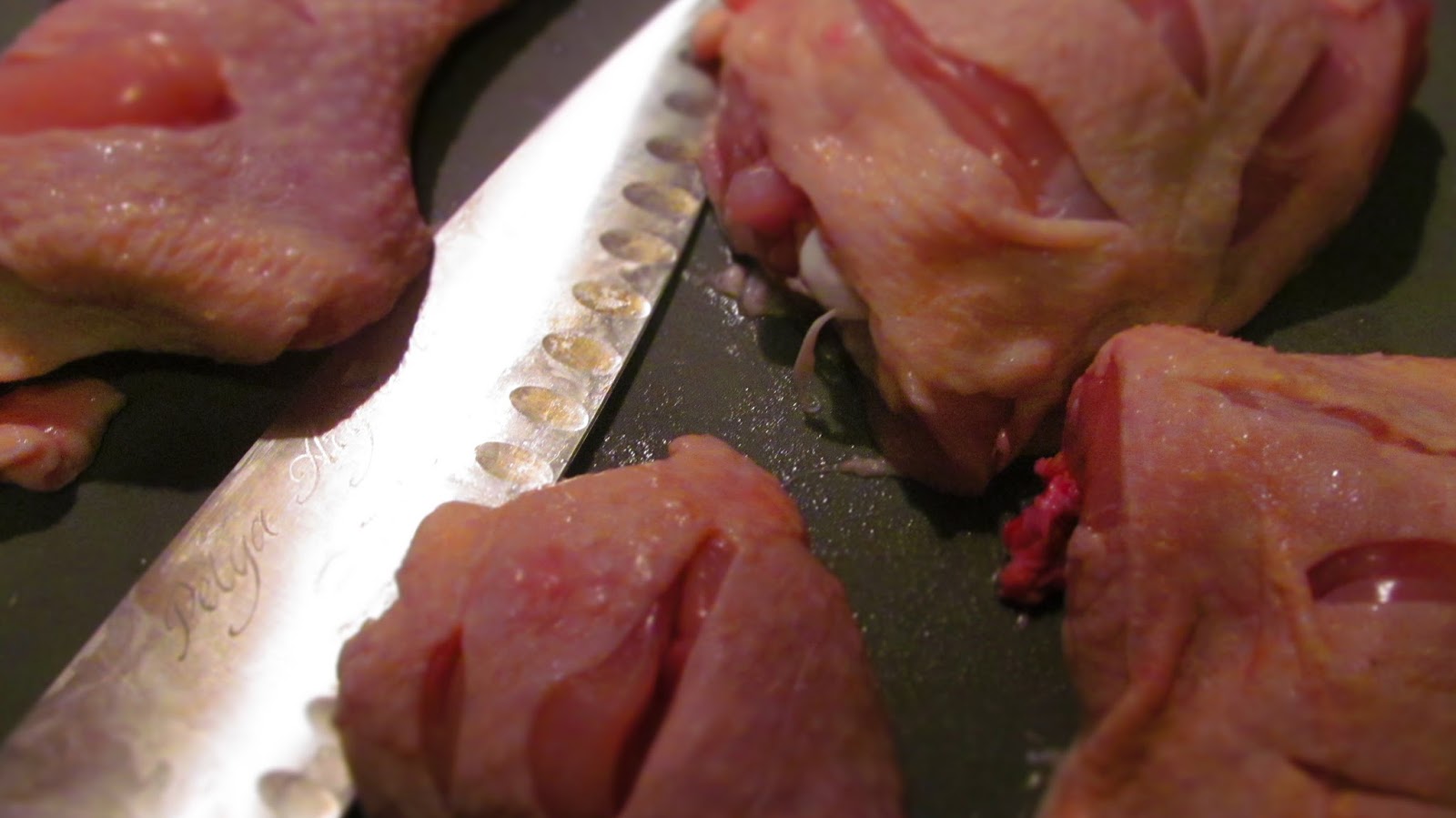 - Пилешките бутчета измих, почистих, разделих на две части всяко и без да отстранявам кожата им направих разрези до кокал с остър нож на две – три места. Така получих четири порции.