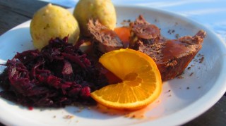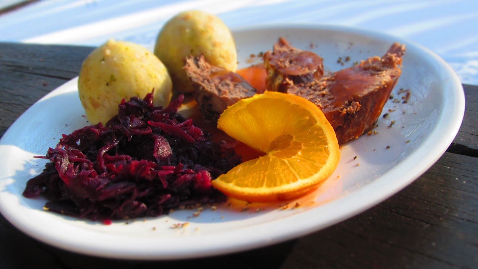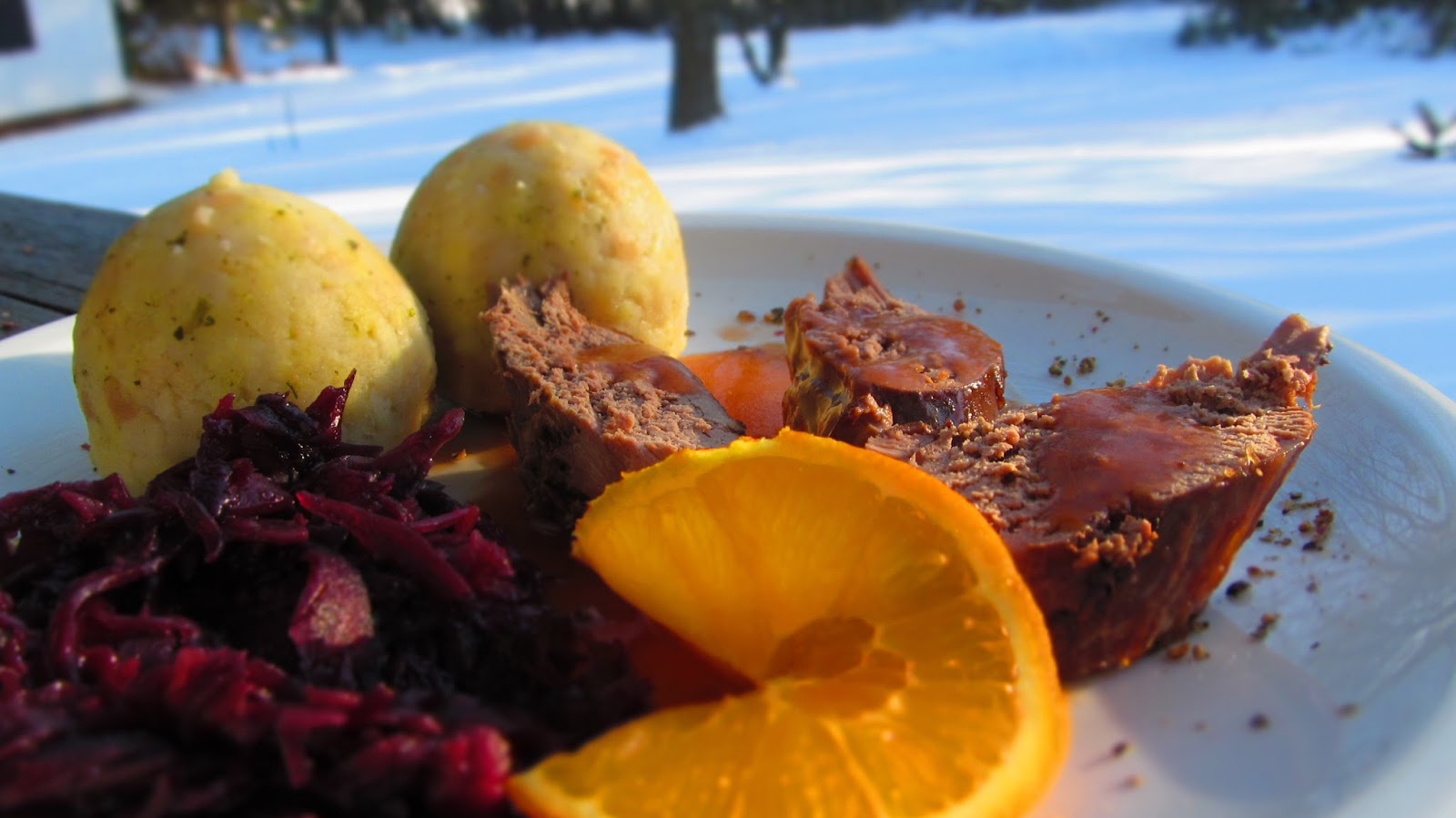 Рецептата е типична за района, в който живеем и е от същия този ловец. Гарнитурата задължителна за всяко дивечово месо, приготвено в нашия район е кнедли и червено зеле.