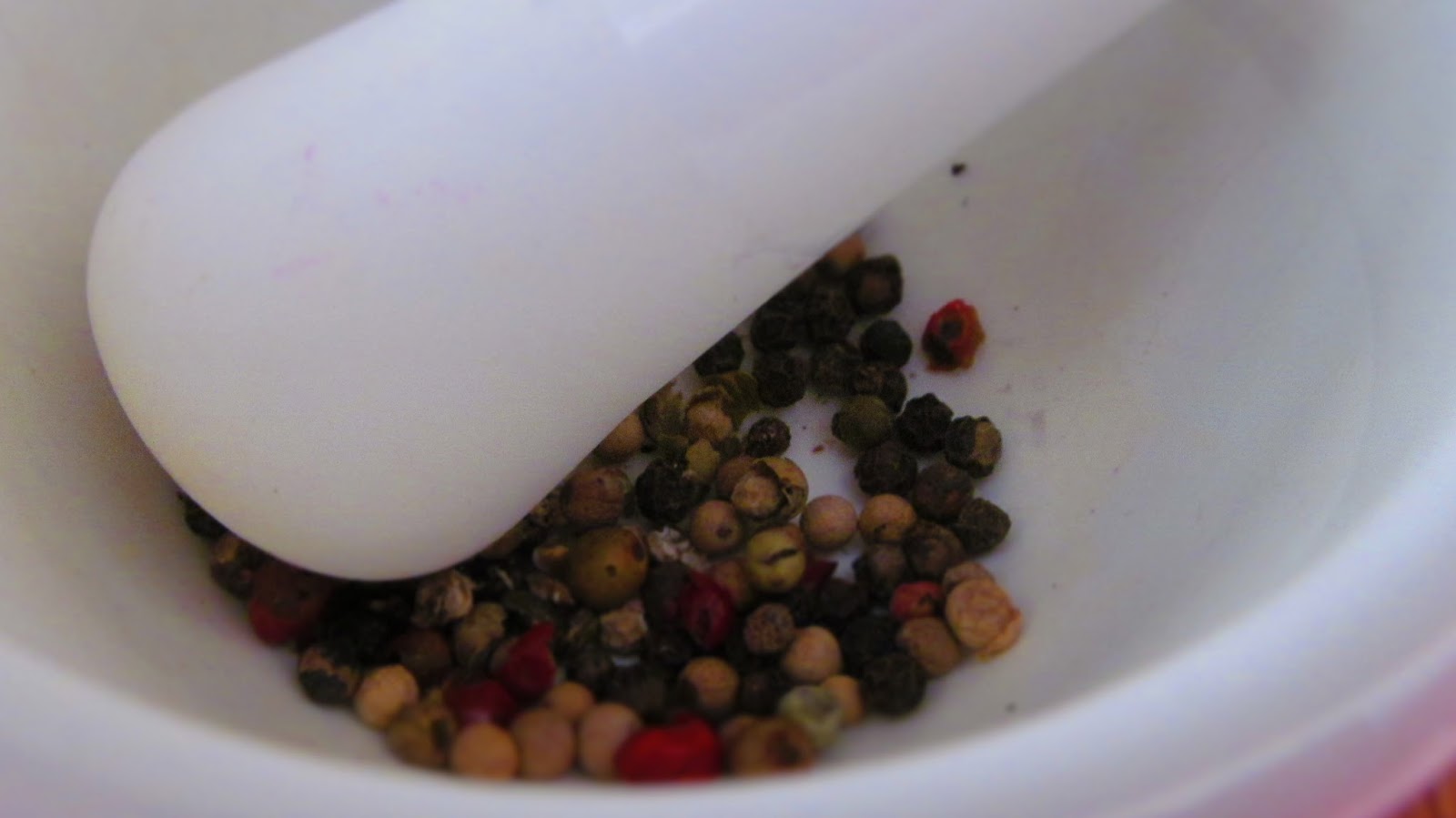 - За декорация на чините използвах едро счукан шарен пипер. С него поръсих чините по ръбовете.