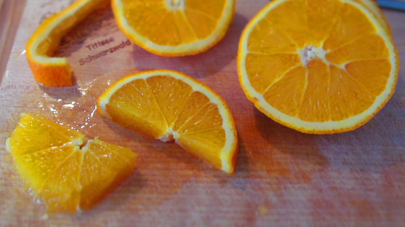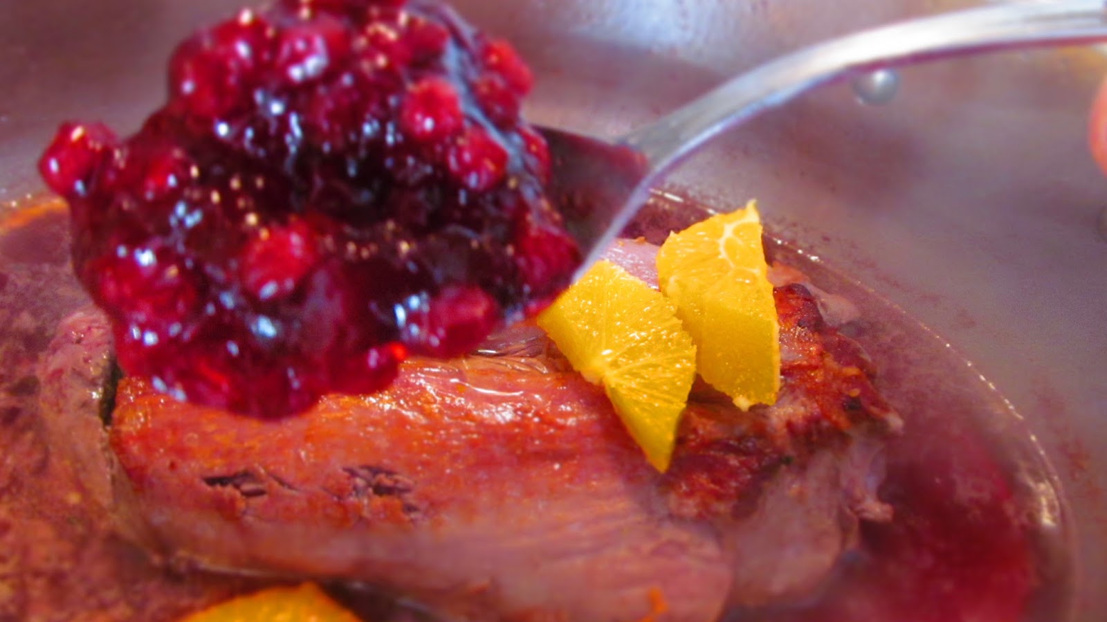 Сипах малко от соса в средата на чинията и подредих върху него парчета от сърнешкото филе. Добавих гарнитурата и декорирах с парче портокал.