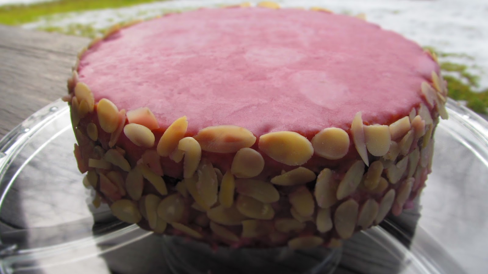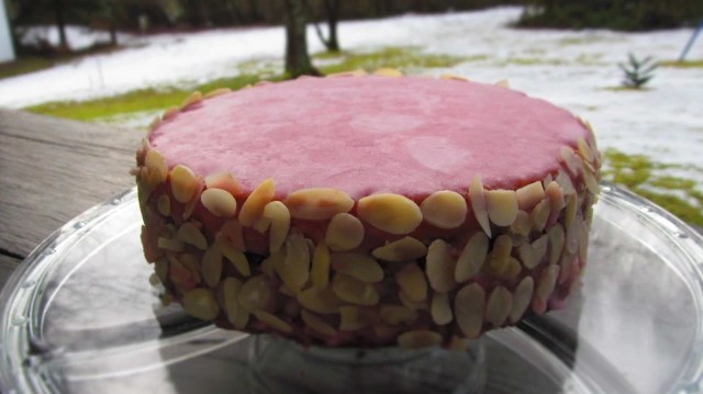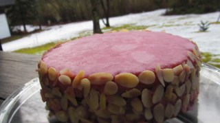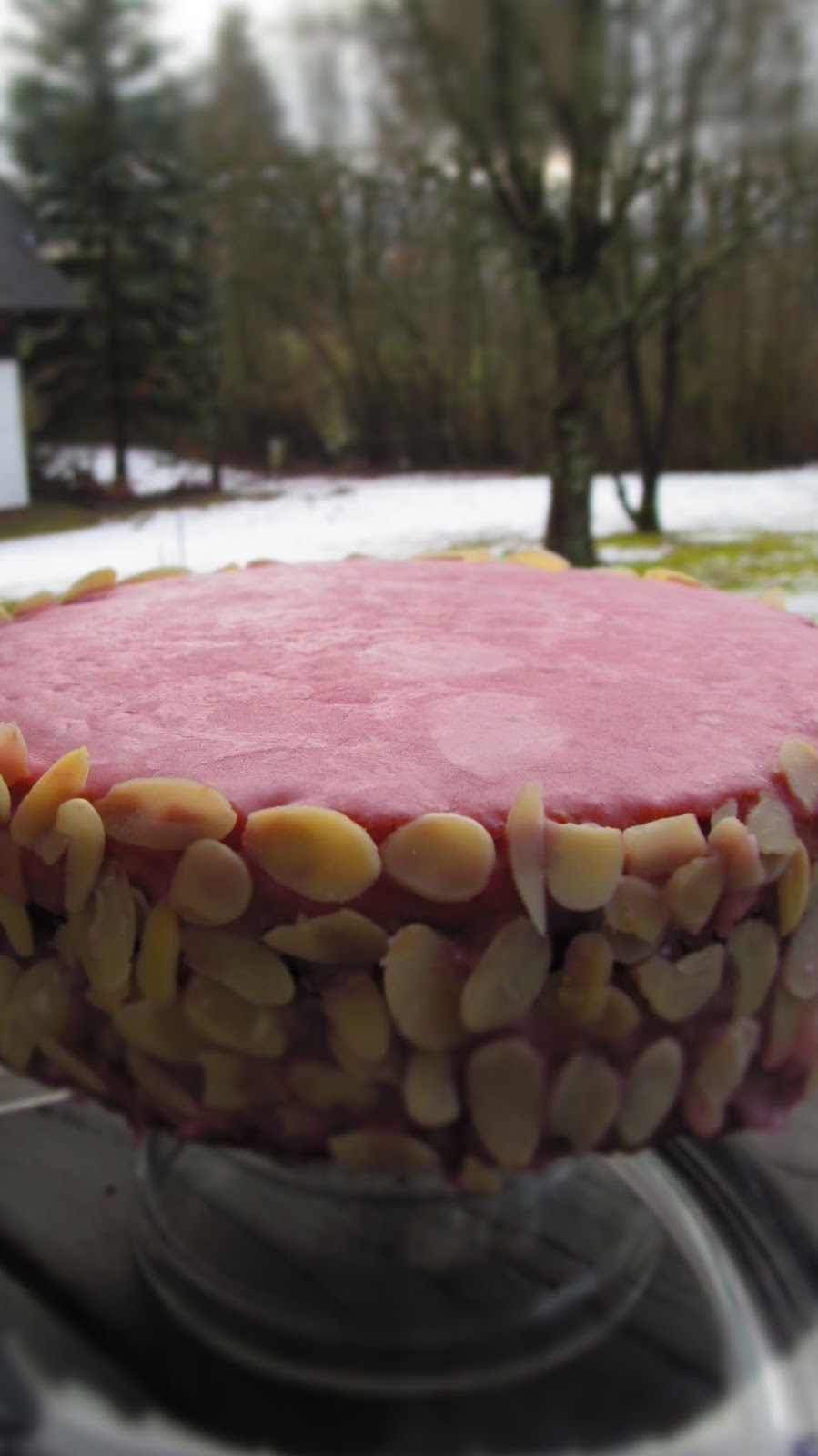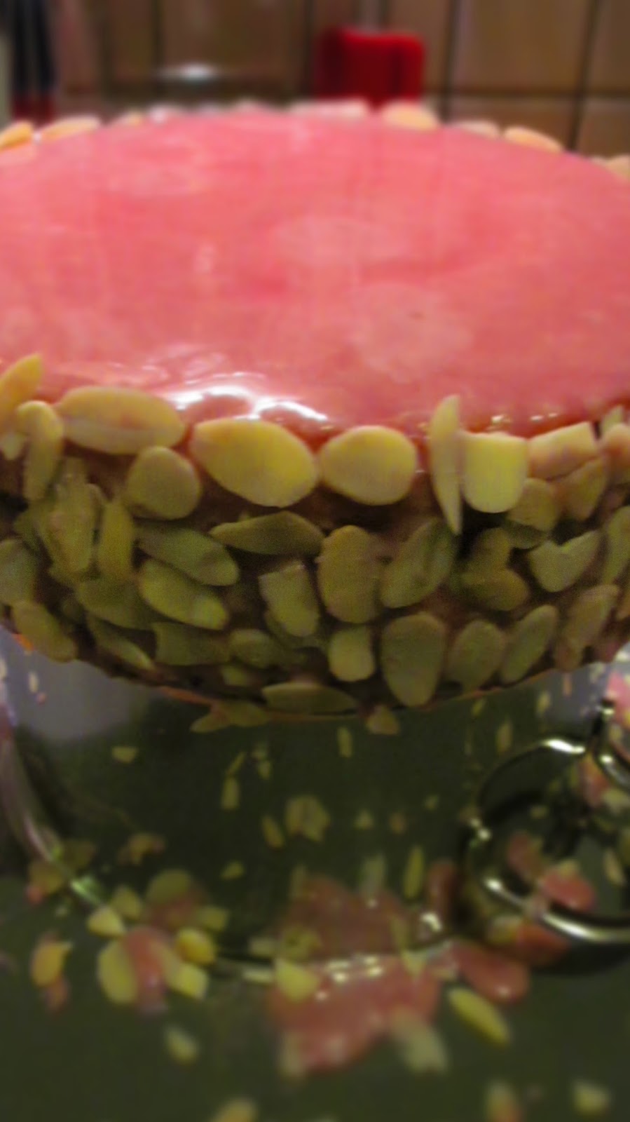 Тази торта е едно съчетание от маслено тесто, череши, марципаново тесто и розова захарна заливка. Декорацията от бадеми допълва само това невероятно съчетание.