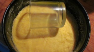 - Охладенето тесто разстилам на дъното на формата като с помощта на чаша изравнявам.