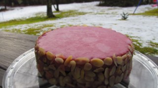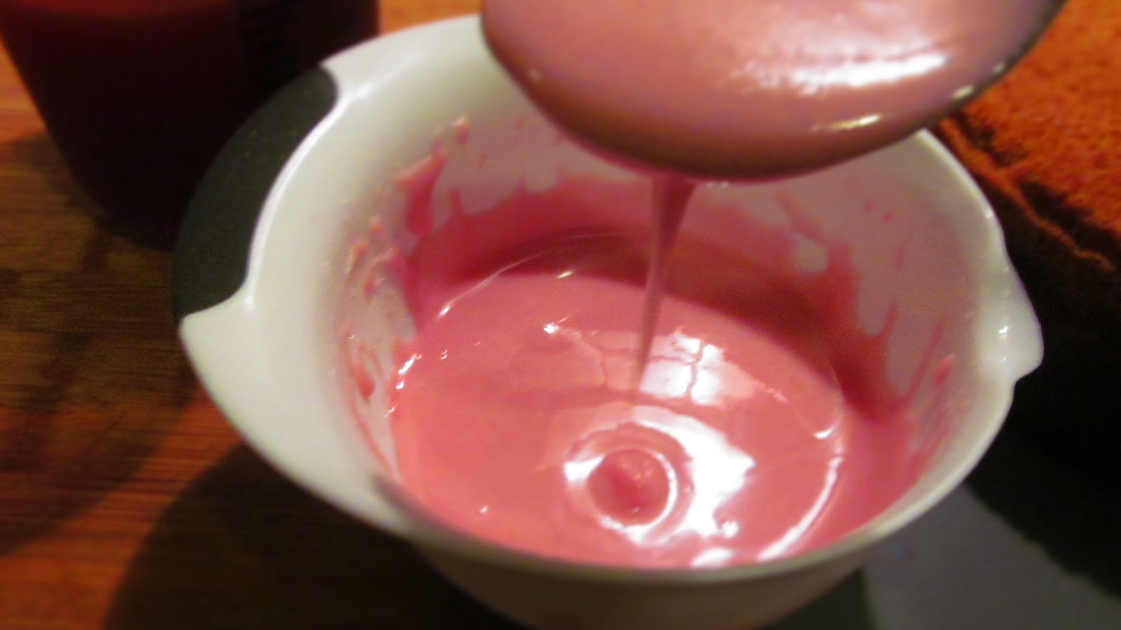 - Когато тортата е напълно охладена, смесвам пудрата захар и сока от череши. Разбърквам до получаването на гъста розова каша.