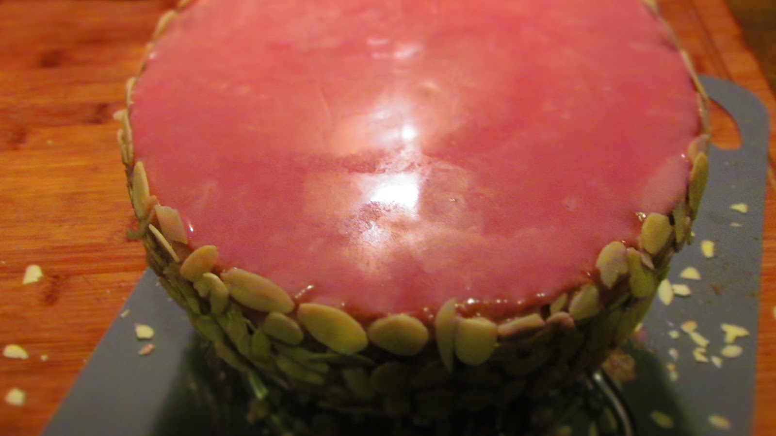 - Залепям бадемовите люспи отстрани на тортата и оставям глазурата да стегне.
