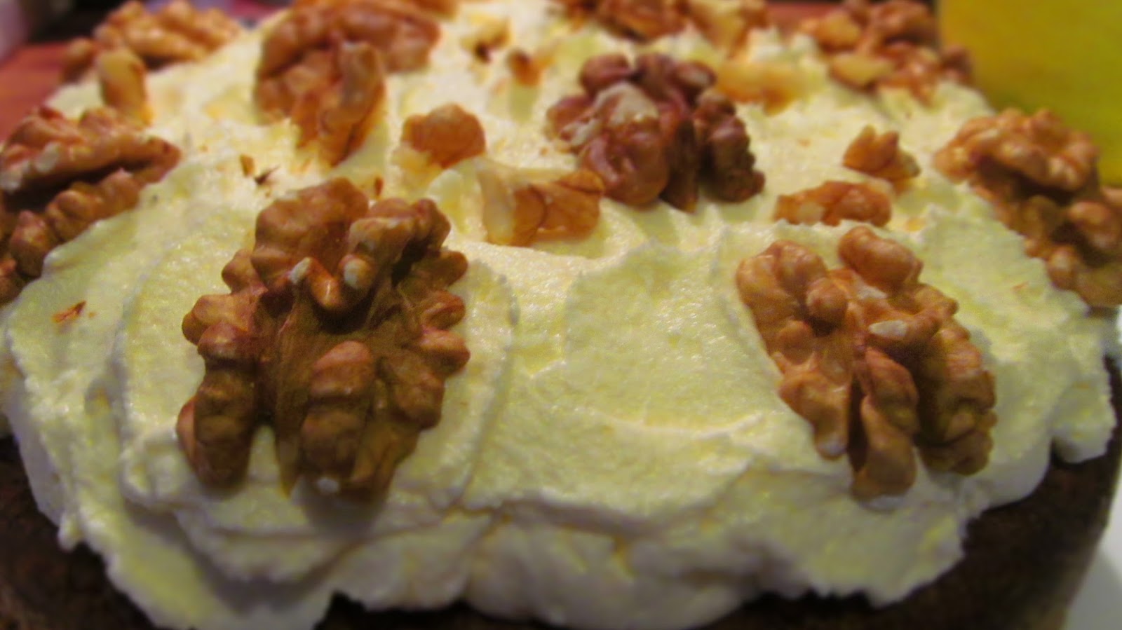 - Украсявам с оставените на една страна орехови ядки, като една или две от тях начупвам с пръсти върху крема.