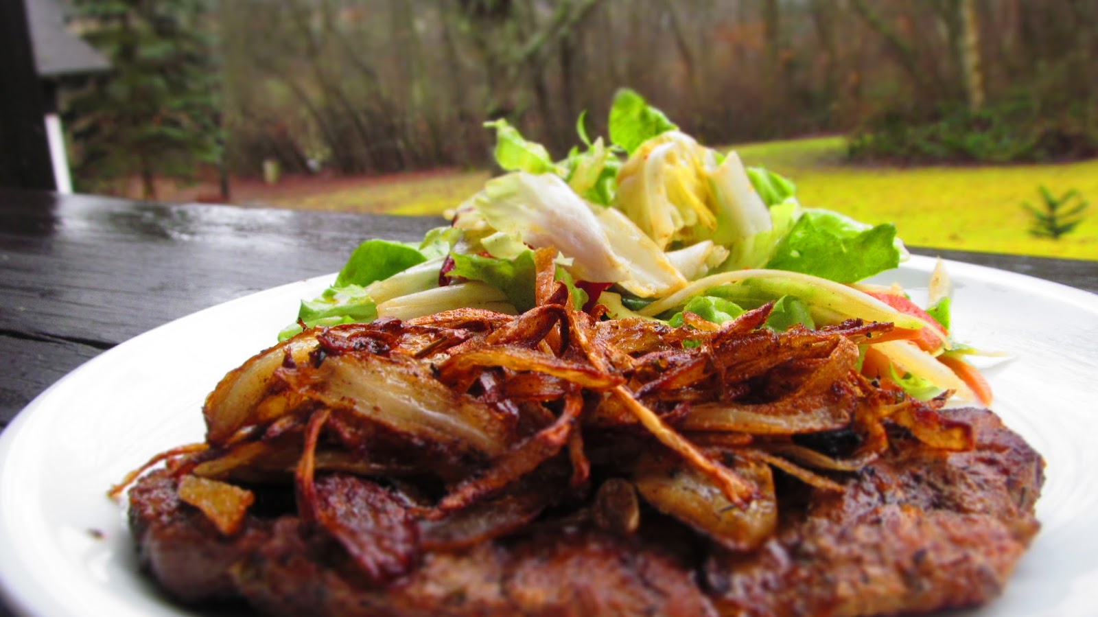 - Тогава загрявам тефлонов тиган и изсипвам всичкия лук и мазнина в него. Изпържвам за кратко и сервирам върху пържолките.