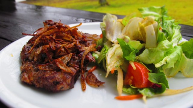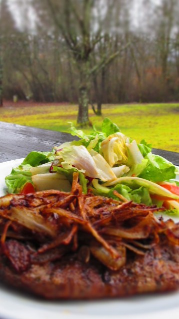 - Покривам пържолите обилно с лентичките лук. Колкото повече лук, толкова по-вкусни са пържолите.