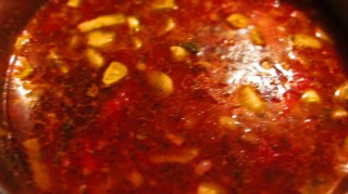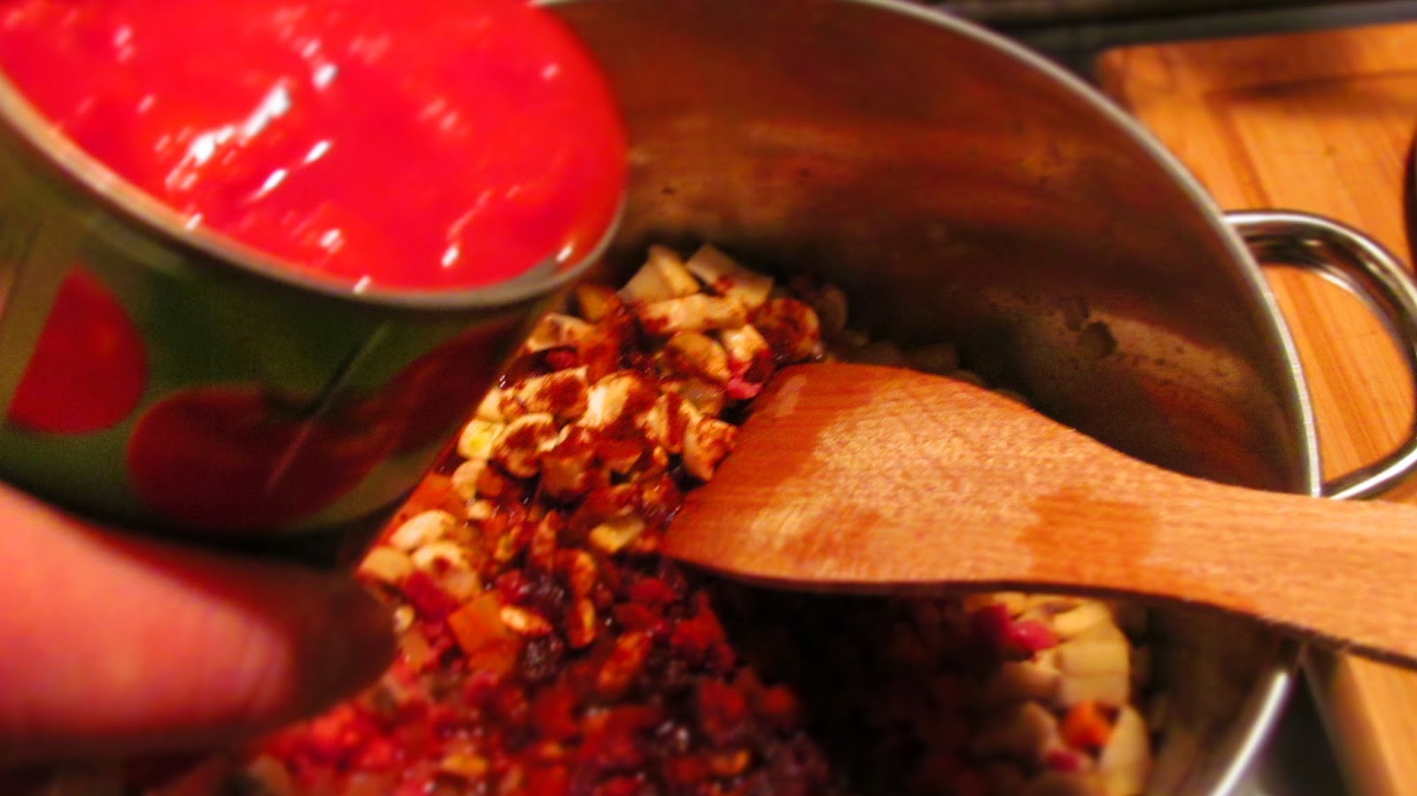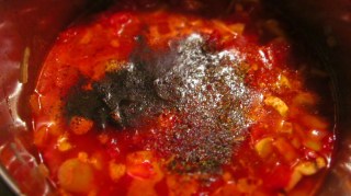 - След 3 минути задушаване дърпам за кратко тенджерата от котлона. Добавям червения пипер, разбърквам и веднага заливам с доматите. Добавянето на червен пипер избягвам да е върху горещия котлон, за да не би много бързо пипера да загори и после да загорчи в ястието. Оставям доматите да поврат 5 минути.