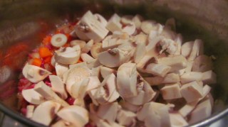 - Към зеленчуците добавям нарязаните на едри кубчета пресни гъби и отново похлупвам.