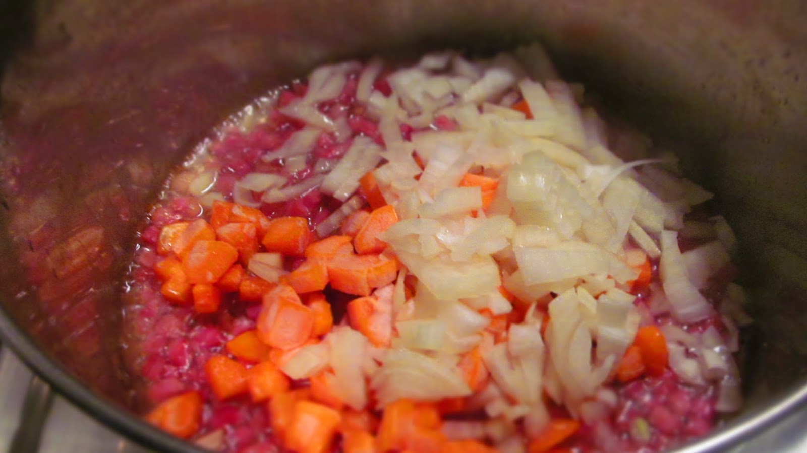 - Добавям ситно нарязаната глава лук, нарязаният на кубчета морков и нарязаните на тънки филийки скилидки чесън. Сипвам половин чаша вода и похлупвам. Оставям зеленчуците да се задушат за кратко.