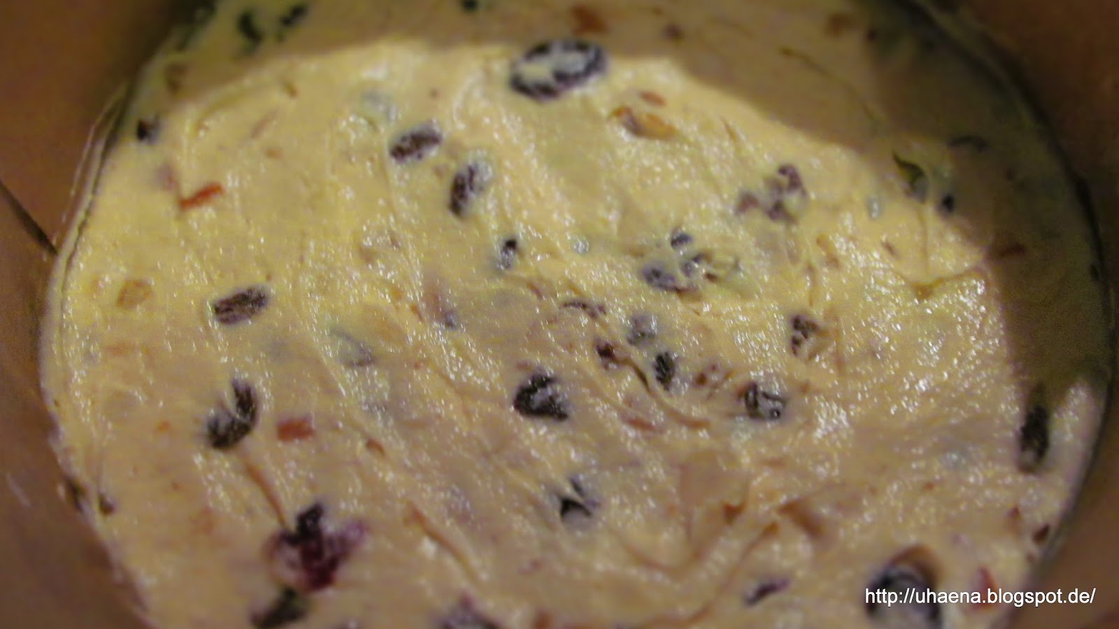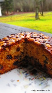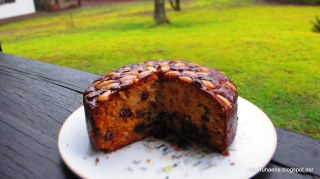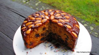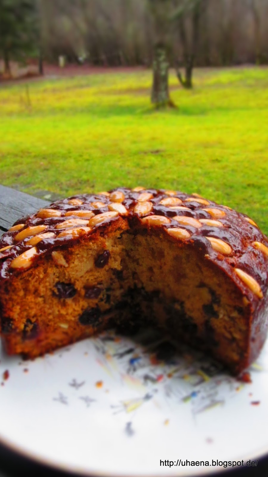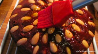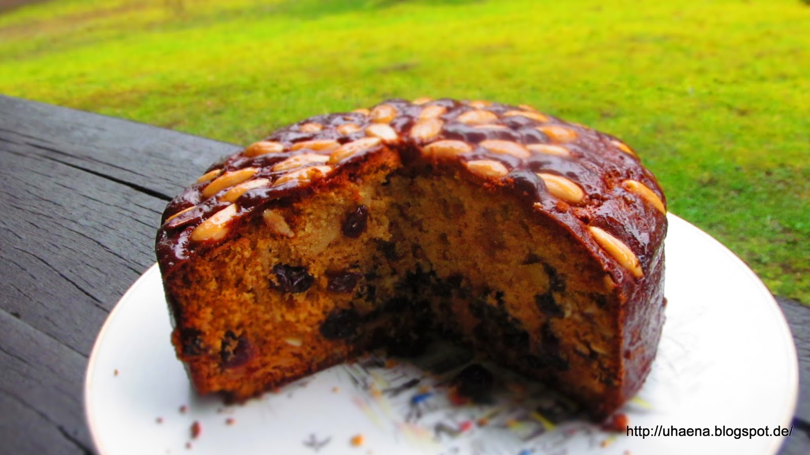 Тази кексова торта е направена с много мед, масло, стафиди, сушени американски боровинки, захаросани кори от портокал и лимон и задължителните белени бадеми. А…да не забравя! Има и уиски, и марципан!
