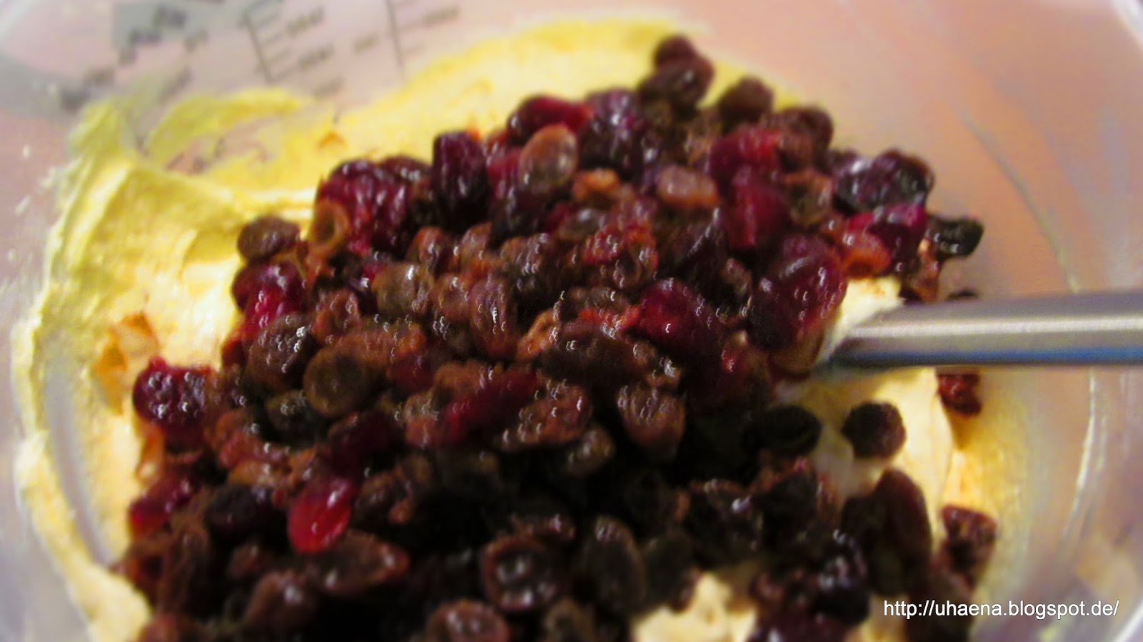 - В купичка изсипвам стафидите и боровинките. Заливам ги с уиски и гореща вода. Разбърквам и оставям за 1 час да се напоят.