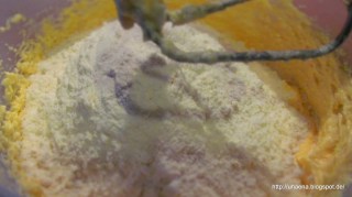 - Смесвам брашното с бакпулвера и го пресявам при крема. Разбивам за кратко с миксера.