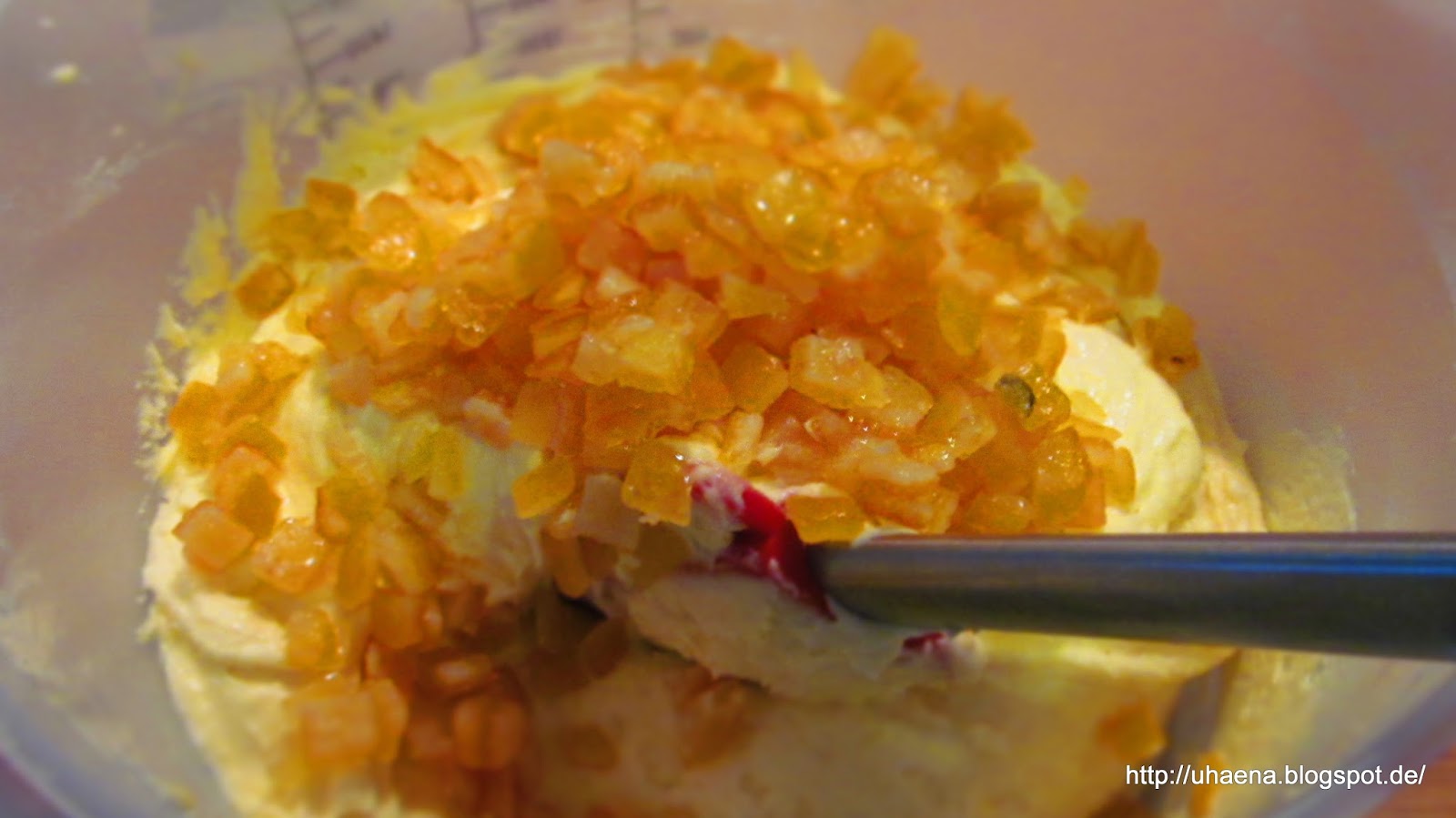 - Прибавям към масления крем захаросаните корички и разбърквам с шпатулата до пълното им размесване.