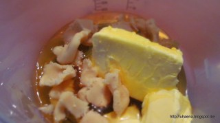 - В купата на миксера смесвам мекото масло, накъсания марципан /може и без него/, щипката сол и течния мед.