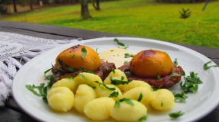 - Добавям към пеперудите в чинията соса и гарнитура по желание. Днес аз използвах замразени ньоки, които сварих според указанието на опаковката. Но това може да са и пържени картофи или картофено пюре. Вие избирате!