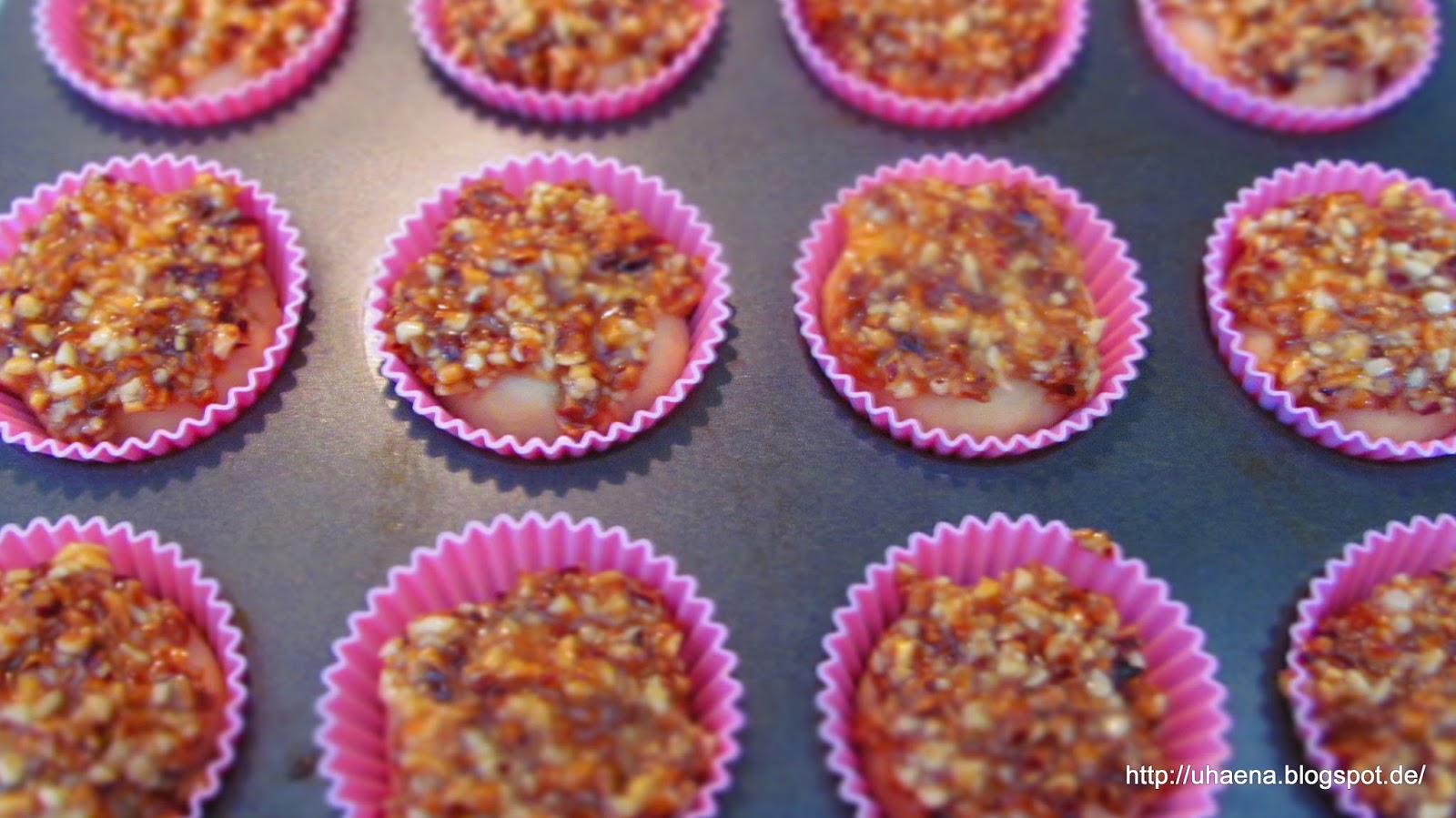 • Разпределям охладената лешникова смес върху втасалите мъфини.