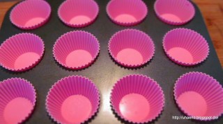 • През това време приготвям формата за мъфини със силиконовите формички. Ако не разпологате с такива – слагате хартиени формички. Ако и хартиени формички нямате, просто намазвате с олио и поръсвате обилно с брашно.
