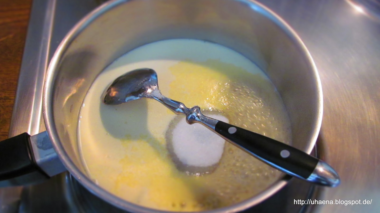 • Останалото прясно мляко загрявам на котлона и когато заври, добавям разтворения пудинг като разбърквам непрекъснато. Старая се да не залепне за дъното на тенджерата.