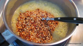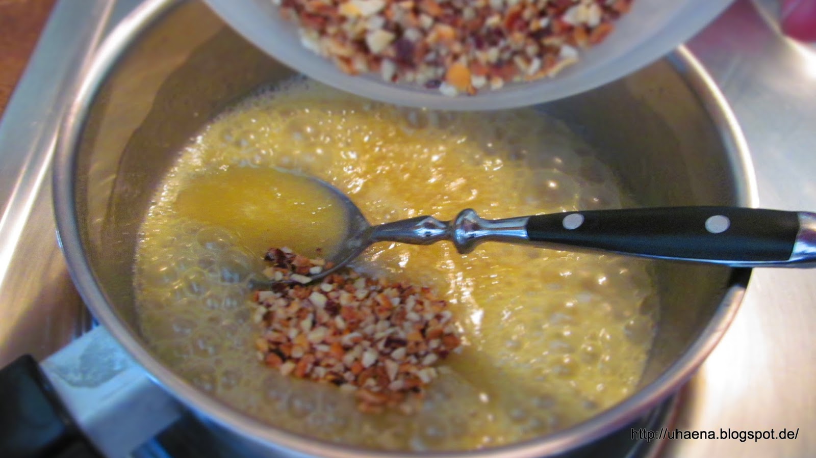 • През това време в тенджерка загрявам сметаната, захарта и меда. Разбърквам и варя около 4 минути на слаб котлон.