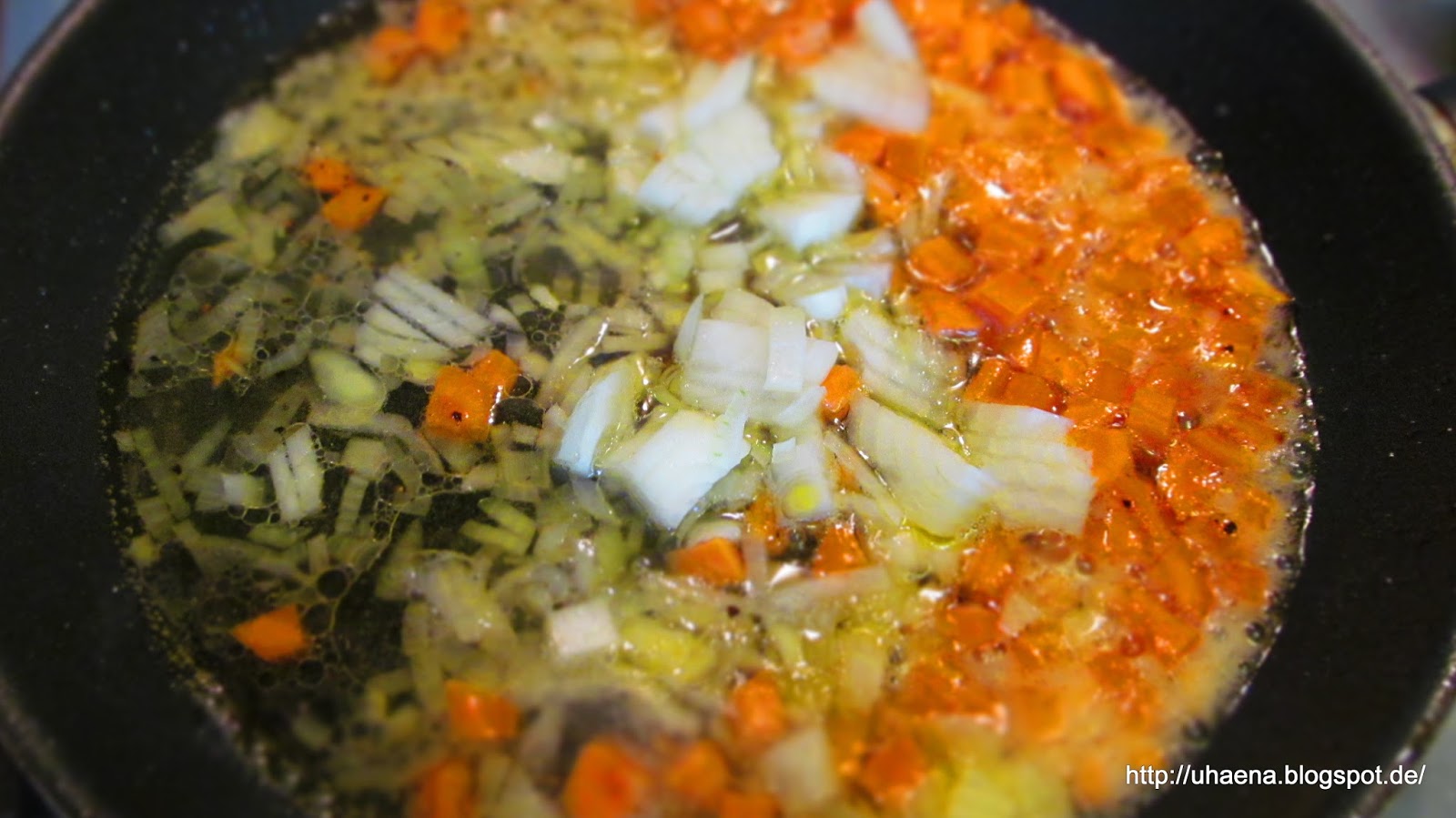 - В мазнината от джоланчетата сипах около 50 мл от бульона и задуших ситно нарязания кромид лук и морковите.