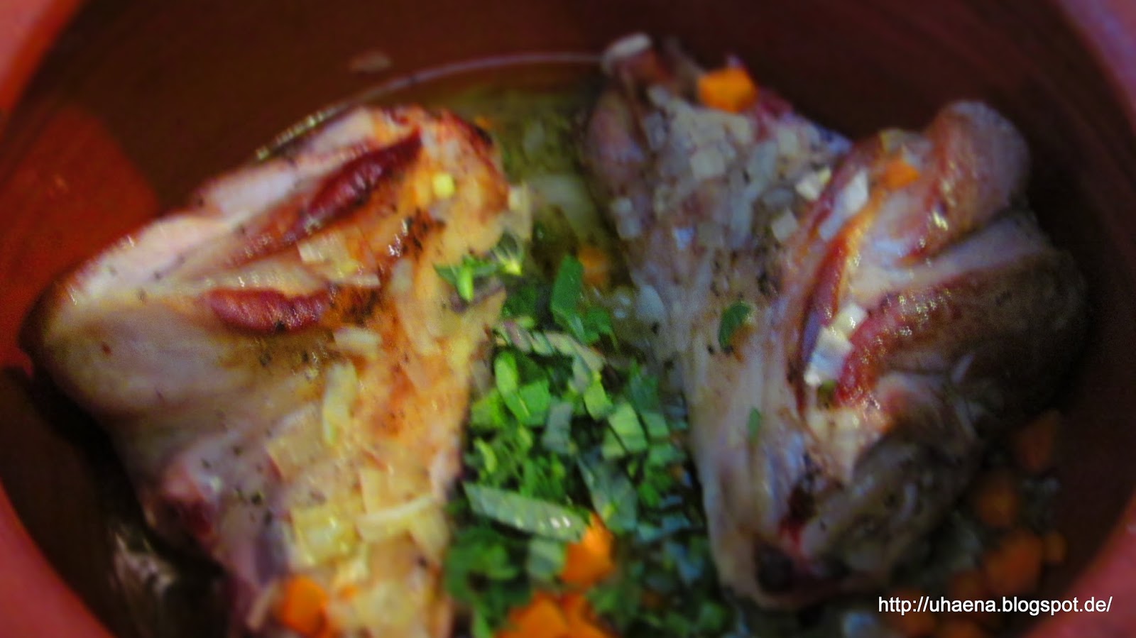 - През това време включих фурната да загрее до 150 градуса и сложих празния гювеч също да се затопли. Винаги се страхувам, че ако сложа горещото месо в студения гювеч, то той може да се спука.