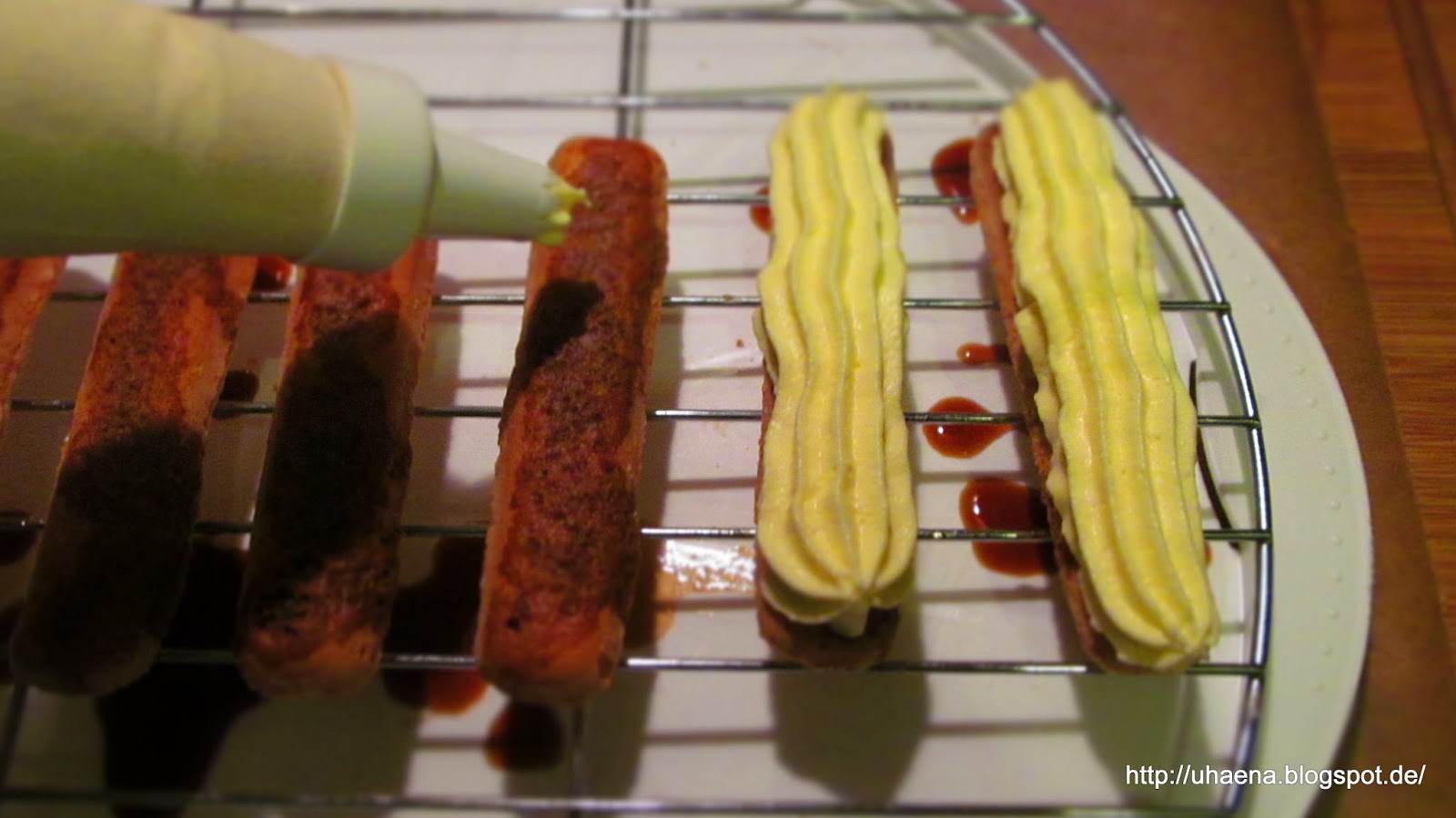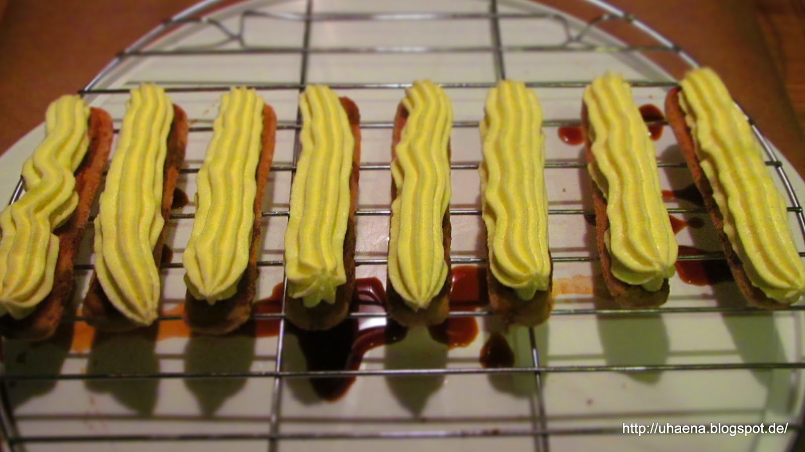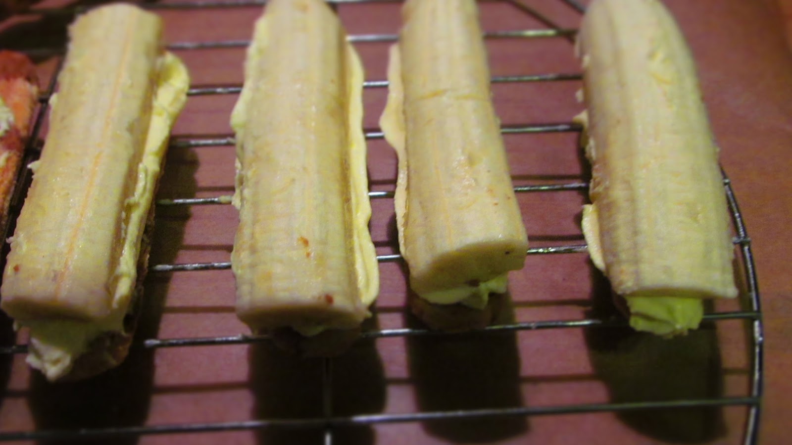 - Излишния крем от притискането на банана загладих с нож. Взимам всеки еклер с ръка, но много внимателно и размазвах.