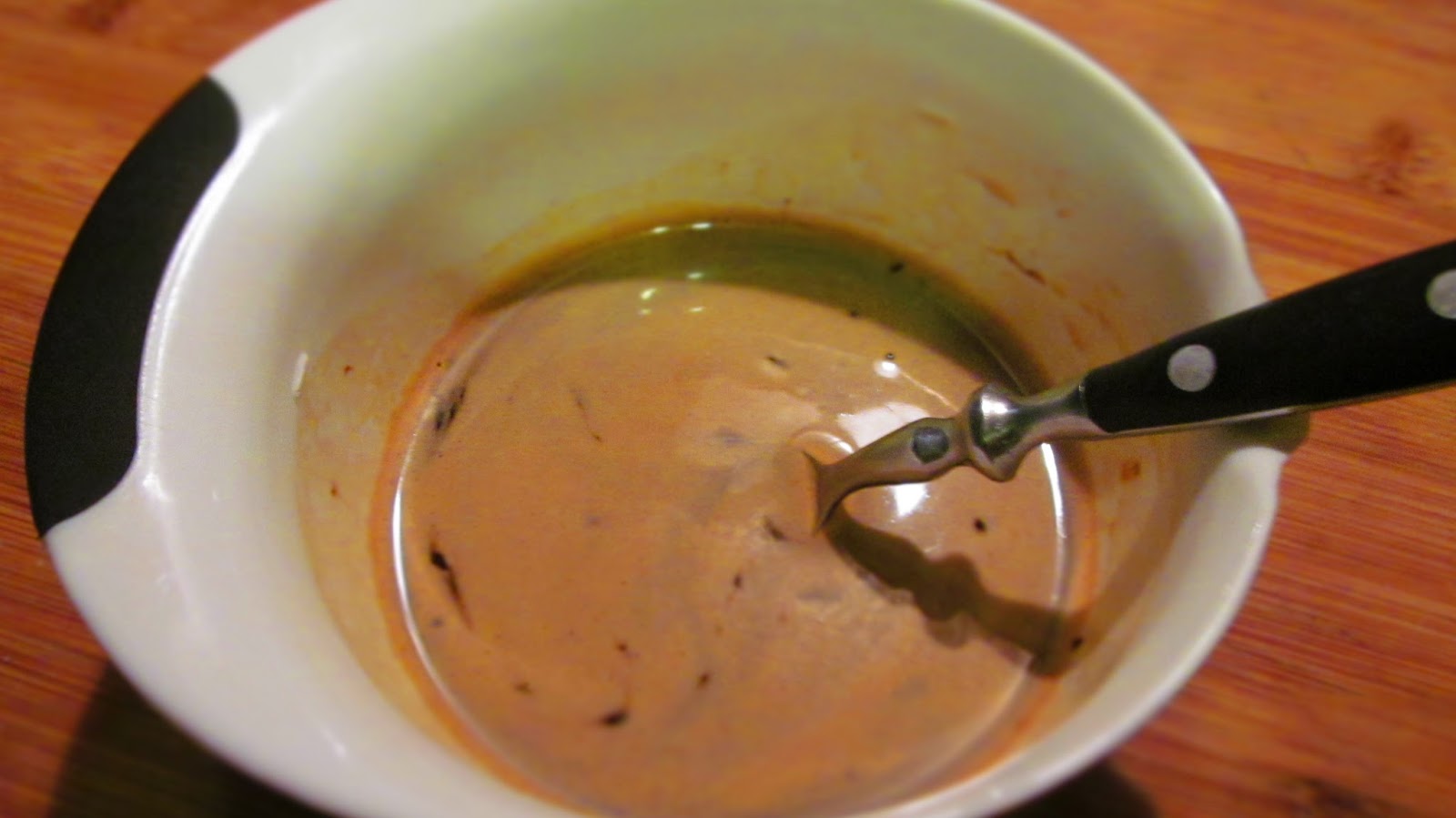- Разбърках много добре с пластмасова лъжичка, добавих и две чаени лъжица олио. Получих гладък и течен млечен шоколад.