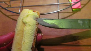 - Изстудения крем изсипах в торбичката на шприца и върху всяка бишкота шприцвах от край до край. Можете да използвате и най-обикновена найлонова торбичка. Не е нужен и накрайник. Важното е да се разпредели равномерно крем по дължина на бисквитата.