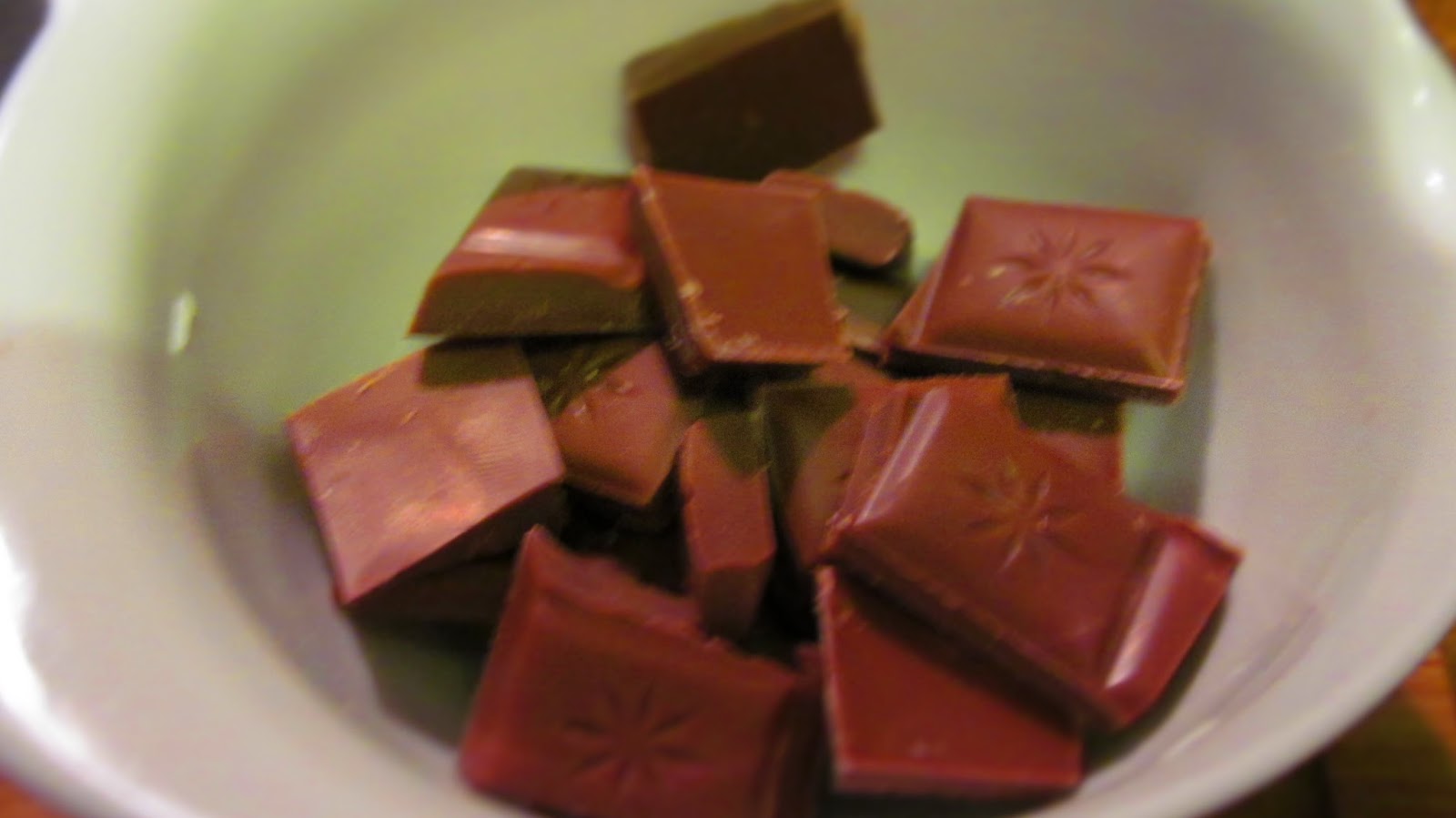 - Начупих млечния шоколад в купичка и разтопих в микровълновата за около 5 минути на 50 % от мощността й.
