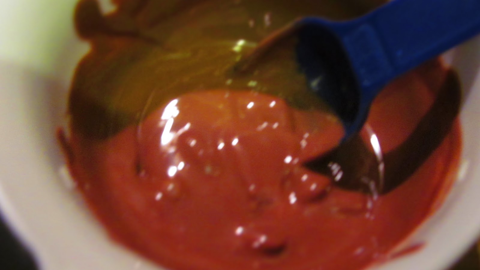 - Изчаках десетина минути да стегне шоколадът и разтопих бял шоколад по същия начин в микровълновата фурна. Добавих една чаена лъжичка олио и разбърках.