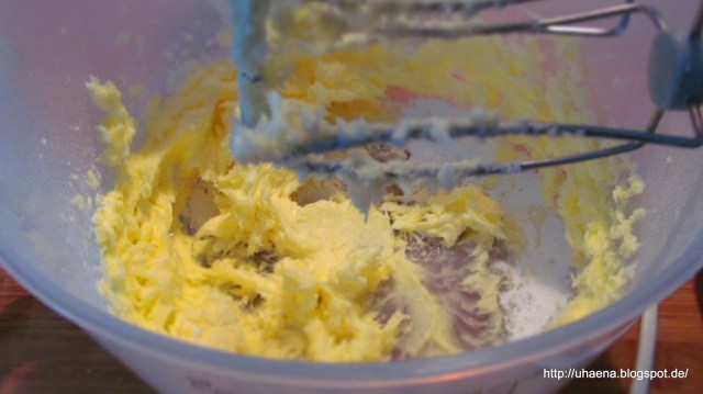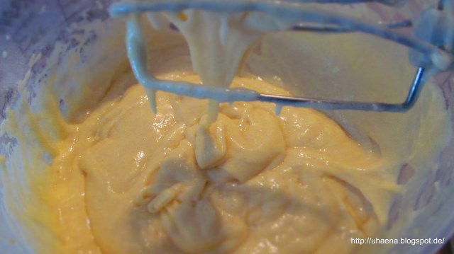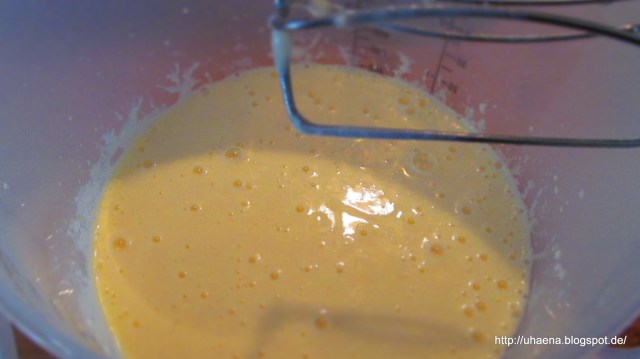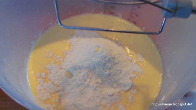- Към течната смес добавям на два пъти сухите съставки и разбивам за кратко.