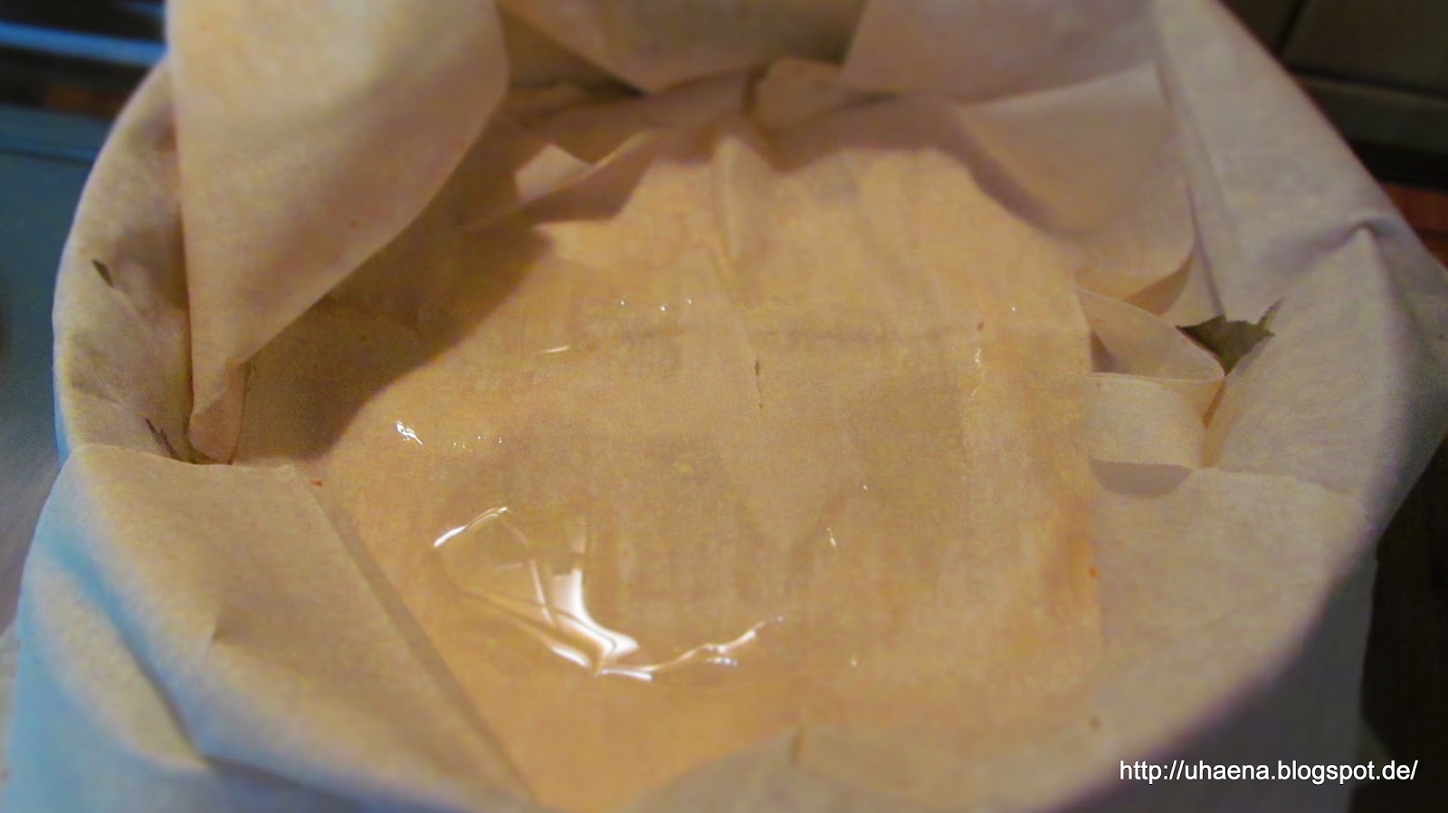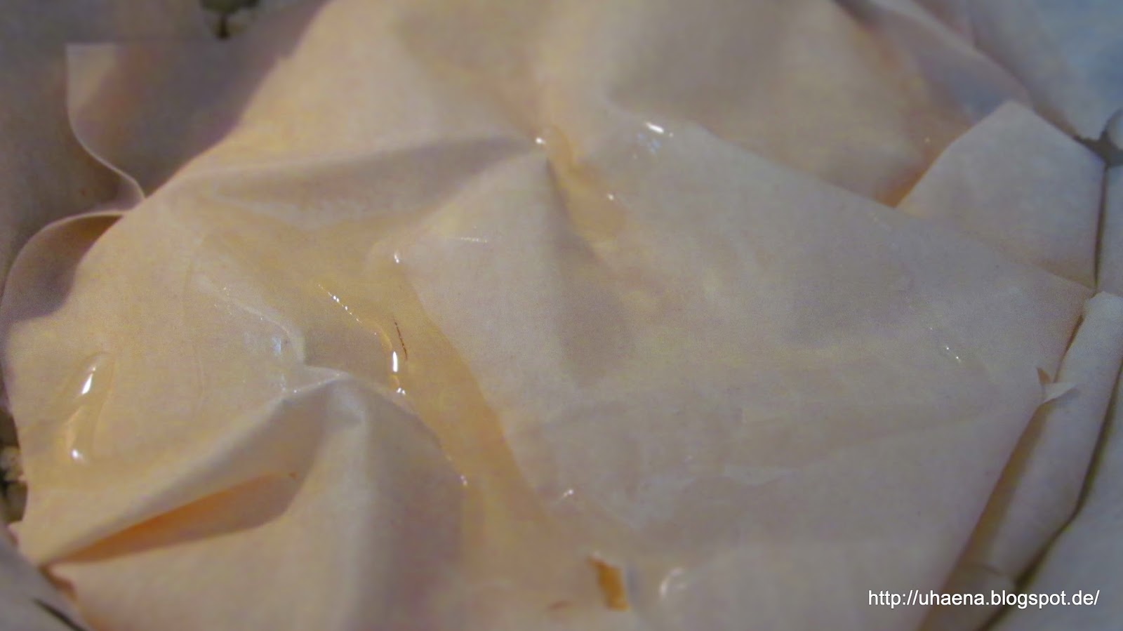 • Покрих всичко с висящите от тавата  краища на корите като не забравях да намазвам помежду им с мазнина. Отгоре също намазах с олио.