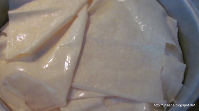 • В подходяща тава с размер 28 см постилам четирите кори за баница така, че да останат достатъчно дълги /15 см/ краища извън тавата, които после ще покрият баницата.