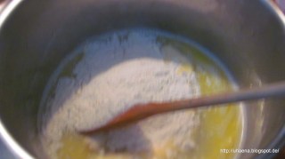 - Сварявате в тенджерата 250 мл вода, солта и маслото.
