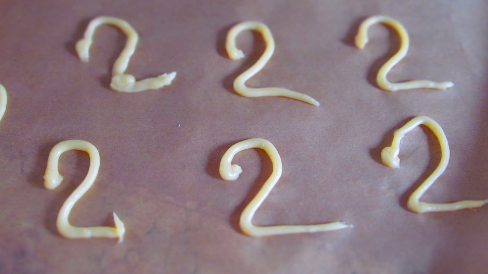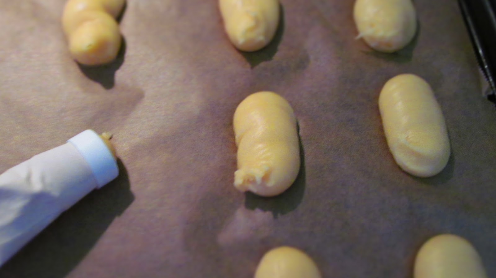 - Изсипвам тестото в торбичка за шприц и в тавичка с хартия за печене и с тънък накрайник шприцвам първо лебедовите шийки – 15 на брой.