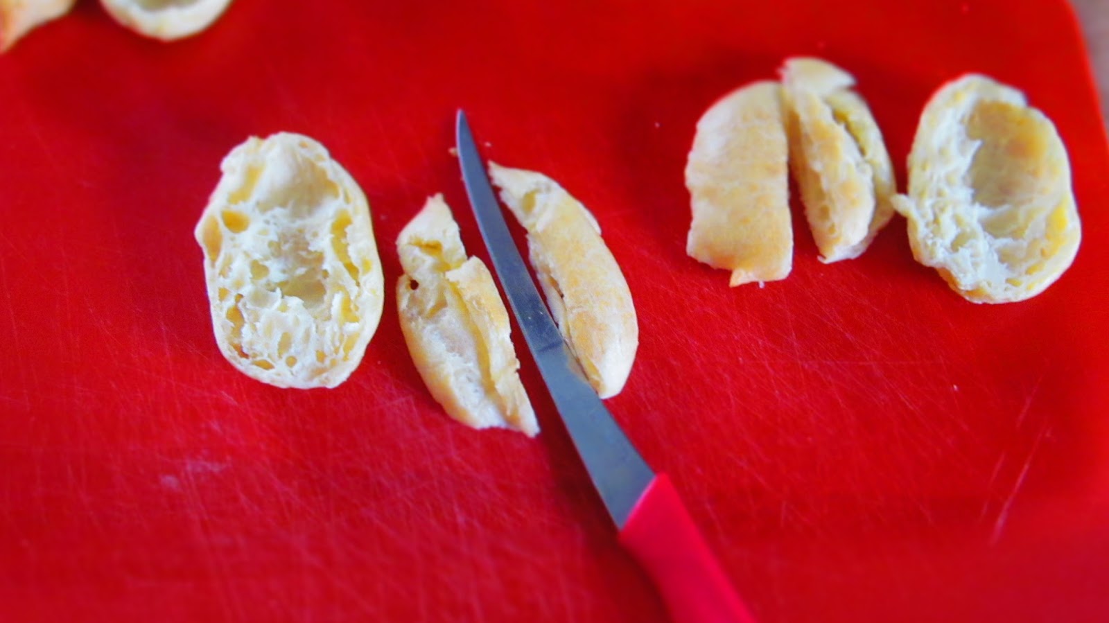 - Охладените еклери с помощта на остър нож разрязвам внимателно на две части.