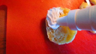 - С помощта на шприца и звездичка накрайник разпределям сметаната върху долната част на еклера.