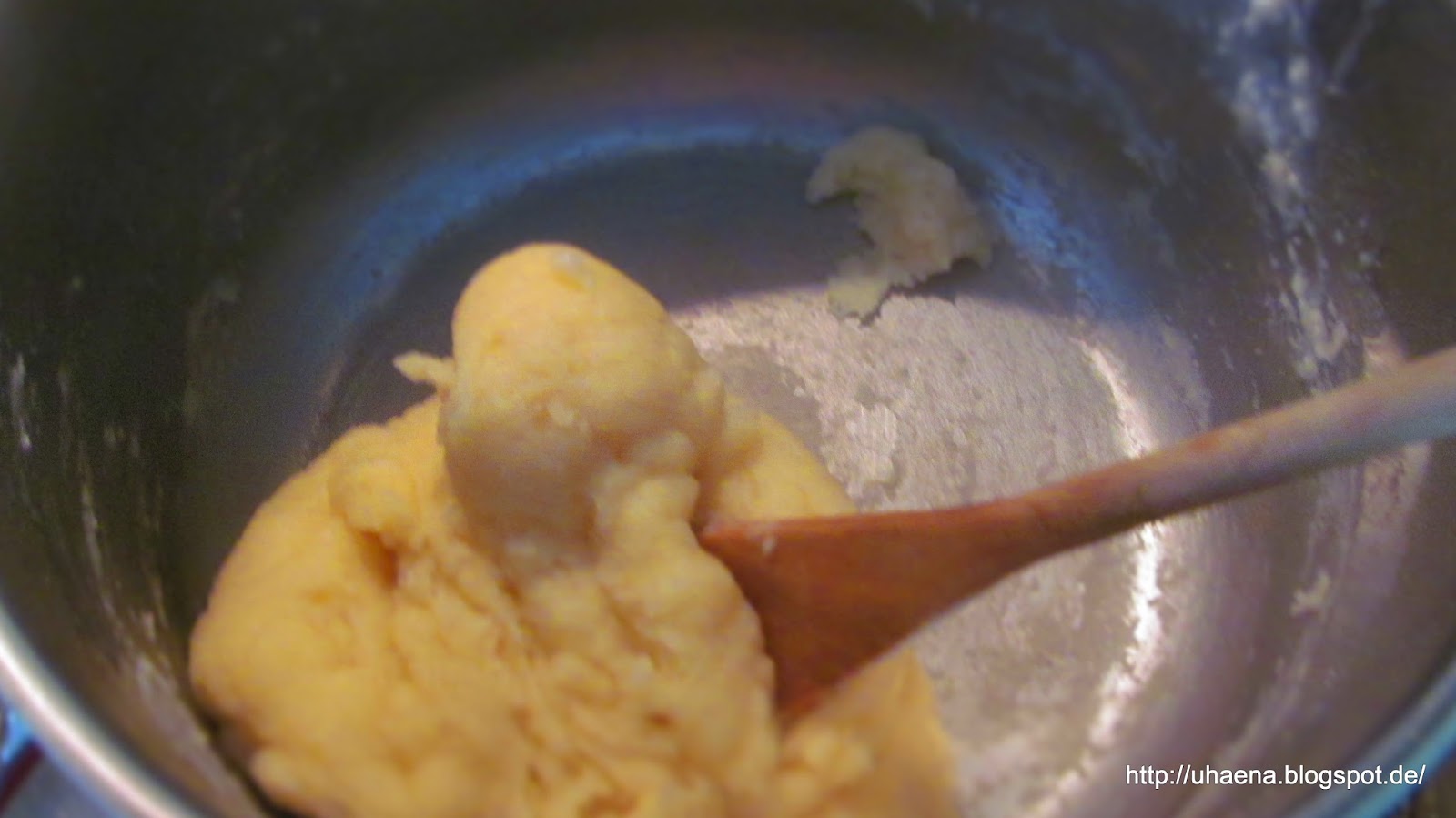 - С помощта на дървена лъжица бъркам сместта до получаването на гладко тесто, което се събира на топка около дървената лъжица.