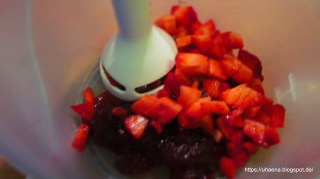 - Ягодите измивам и нарязвам в блендера. Пасирам заедно с конфитюра. С пасатора ми беше малко трудно да пасирам ягодите.