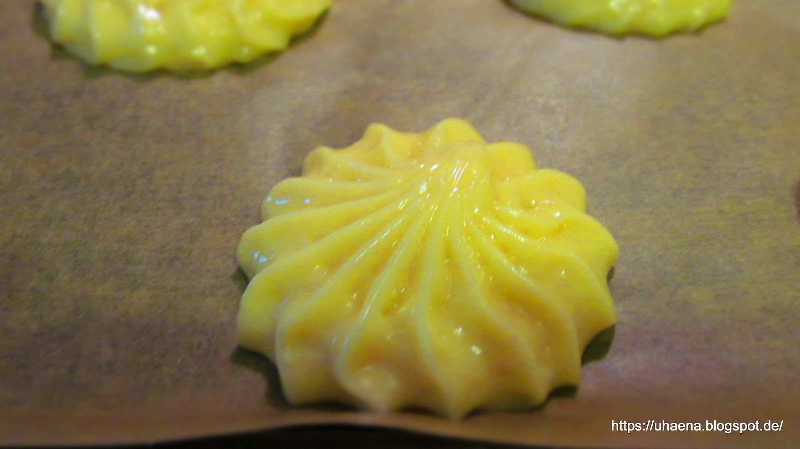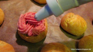 - Тестото изсипвам в шприц-торбичка и върху тавичка покрита с хартия за печене шприцвам от 12 до 16 малки розички или туфички. Може да се сипват и със супена лъжица.