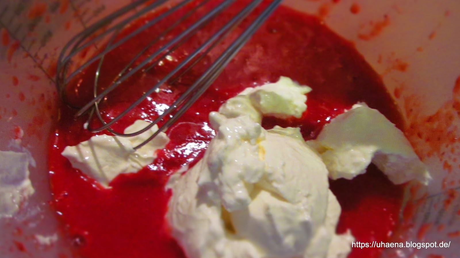- Добавих към ягодовото пюре сметаната и прясното мляко и разбих.