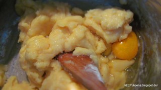- Към леко охладеното тесто започвам да добавям едно по едно яйцата и разбърквам интензивно до пълното им усвояване и получаването на меко тесто.