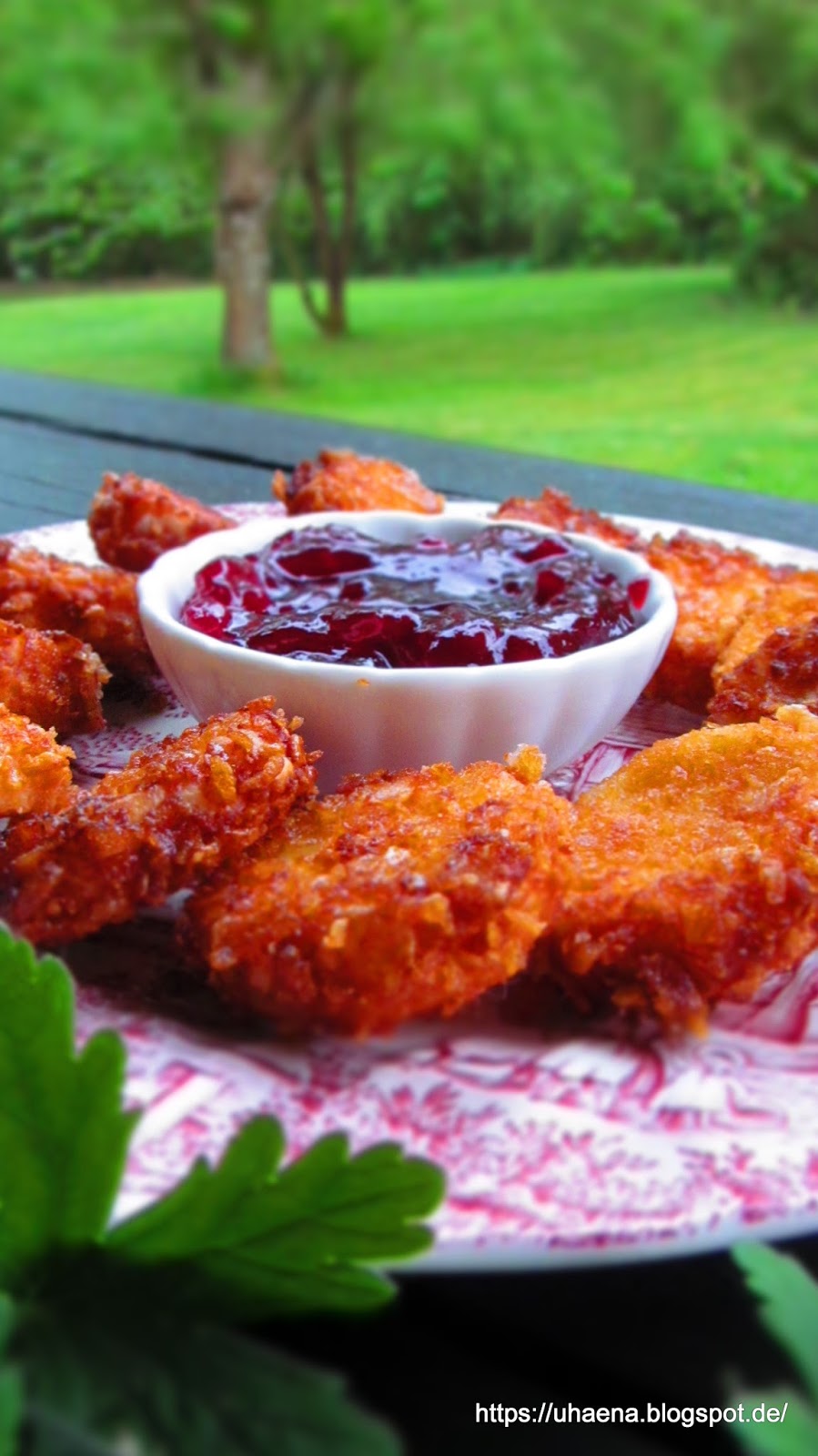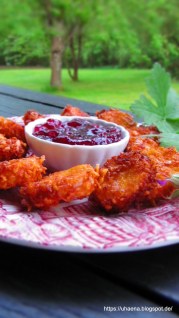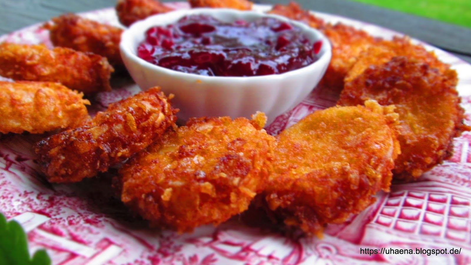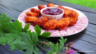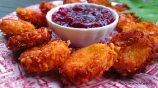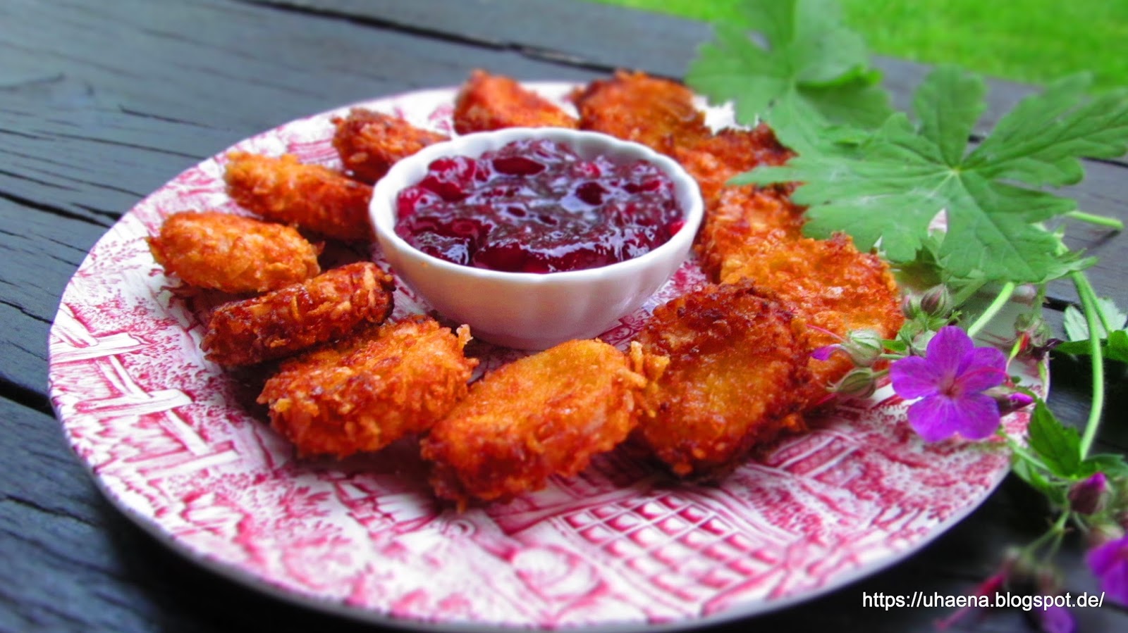 Сервирам панираното в корнфлейкс пушено топено сирене горещо с леко затоплени желирани боровинки или боровинково сладко.