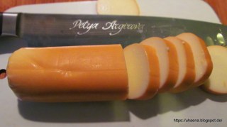 - Обелвам сиренето и с мокър остър нож нарязвам внимателно на филийки не по-дебели от 1 см.