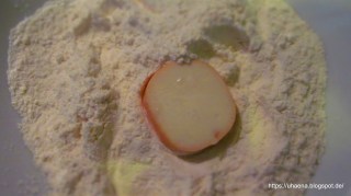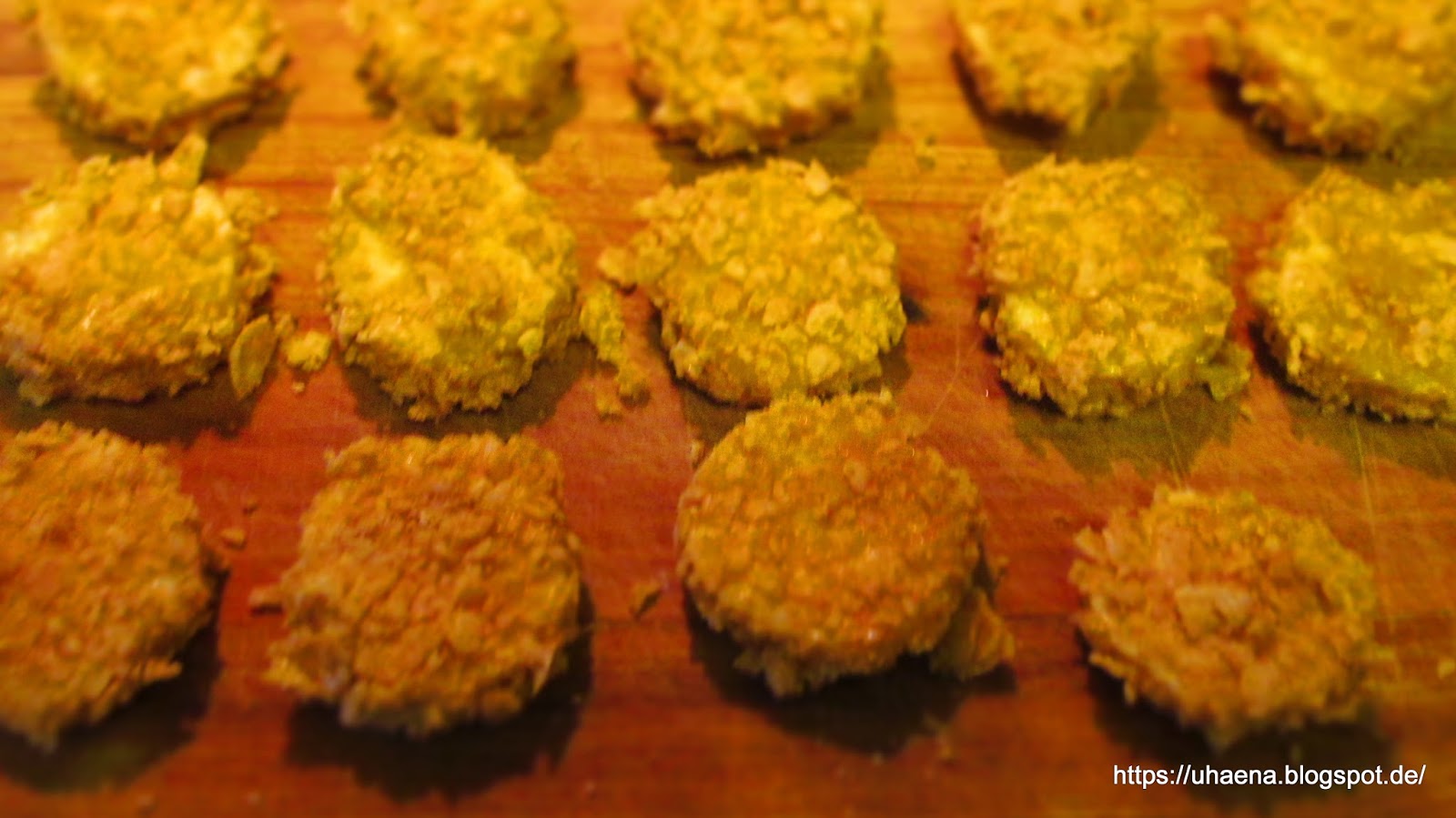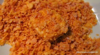 - …и най-накрая овалвам в корнфлейкса като притискам леко с пръсти, за да залепне панировката много добре.