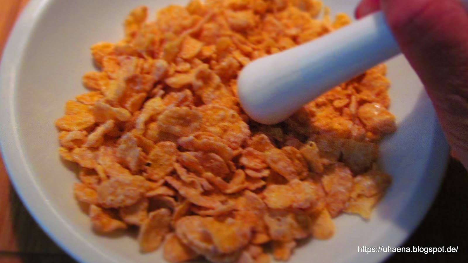 - Изсипвам корнфлейкса в дълбока чиния и внимателно начуквам на ситно. Не използвам блендер, защото става ситен като галета. Ние обичаме панировката на тези сиренца да е хрупкава.