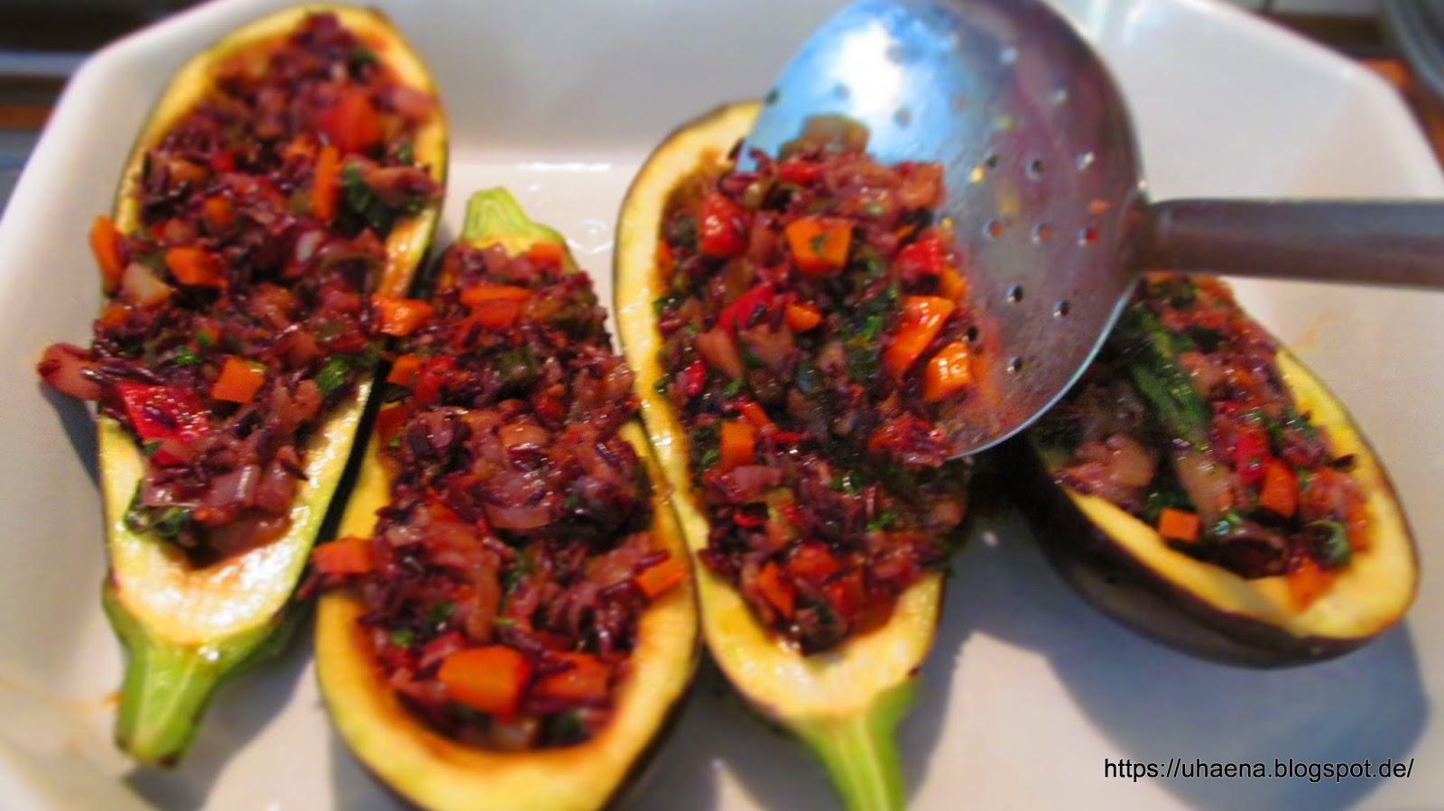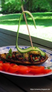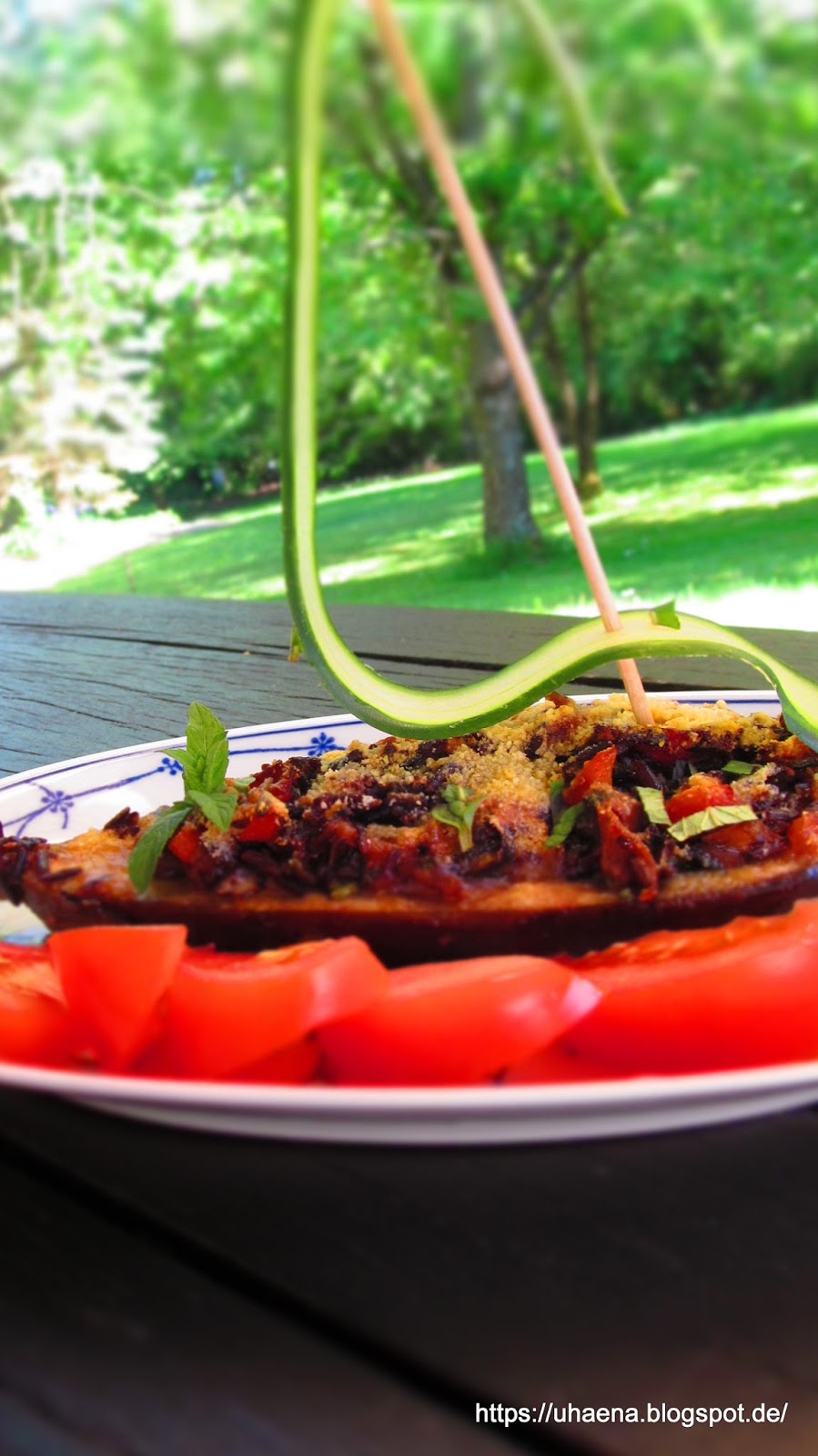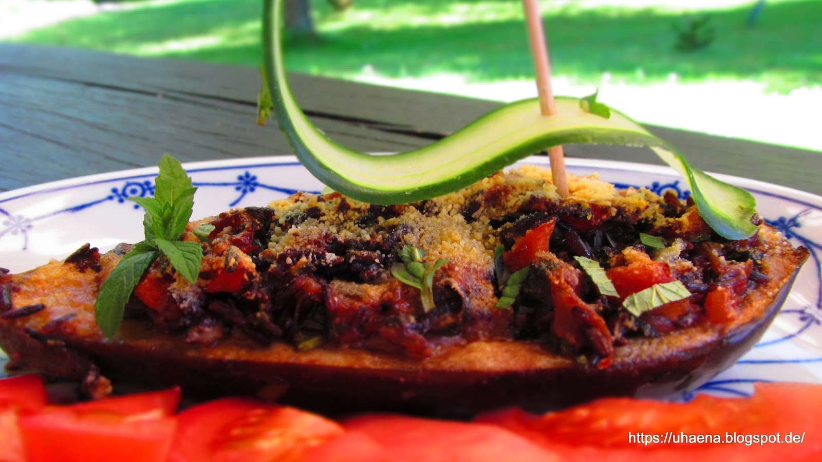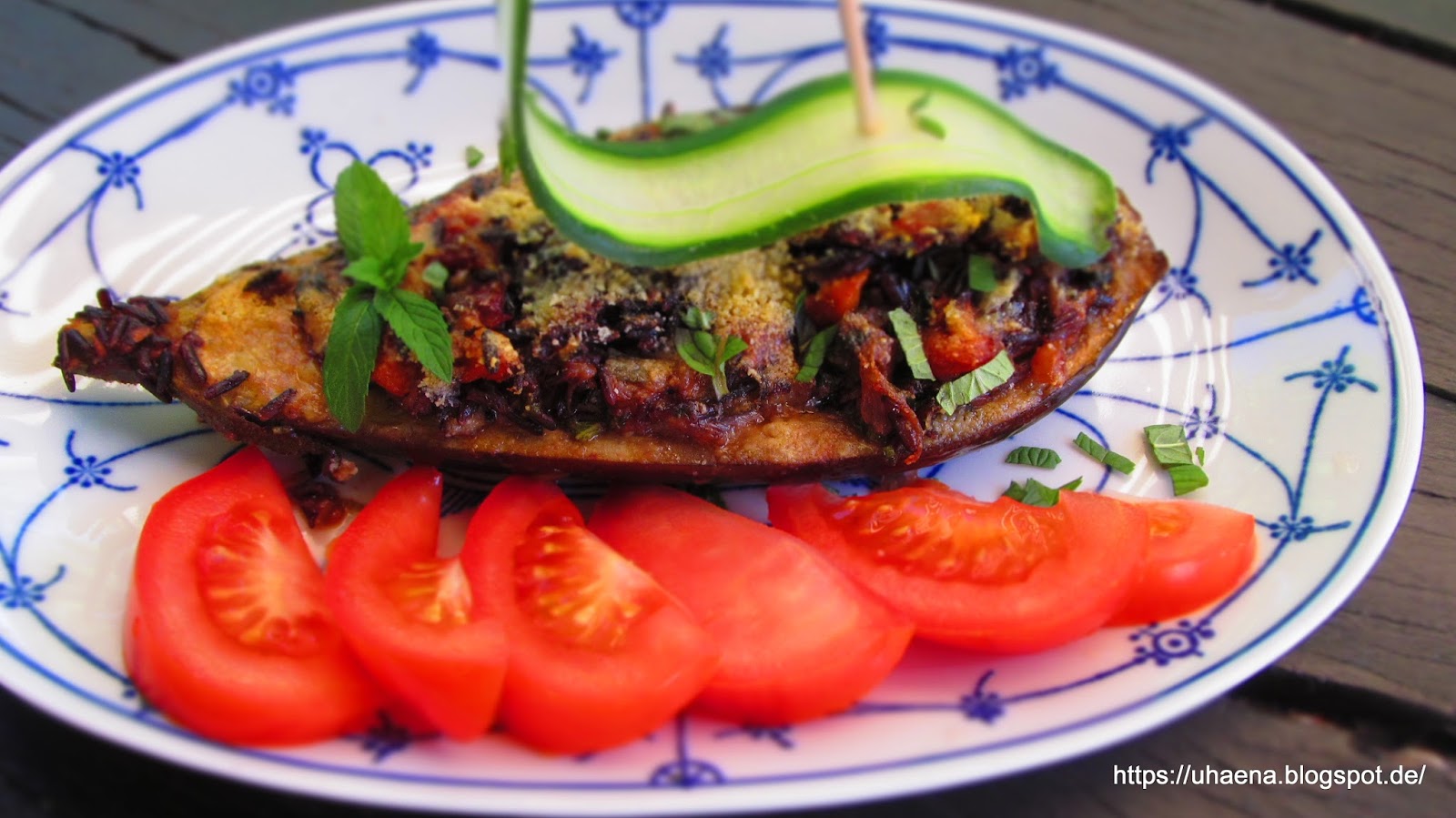 Ние много обичаме у дома имамбаялдъ, чиято рецепта ще откриете ето тук. Точно по този начин приготвих и тези патладжанени лодки, но с добавката и на черен ориз.