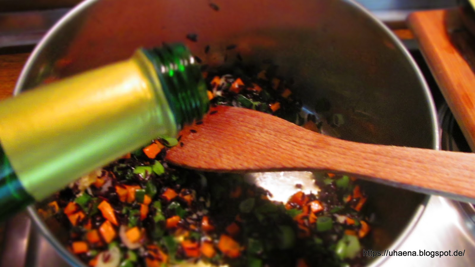 - Веднага след това заливам с виното и зеленчуковия бульон.