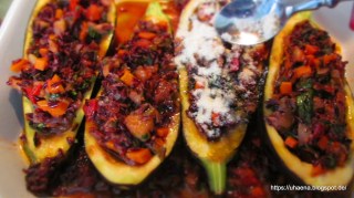 - С помощта на решетъчна лъжица разпределям готовата плънка върху патладжанените лодки. Ако случайно Ви остане плънка, разпределяте я около патладжанените лодки.